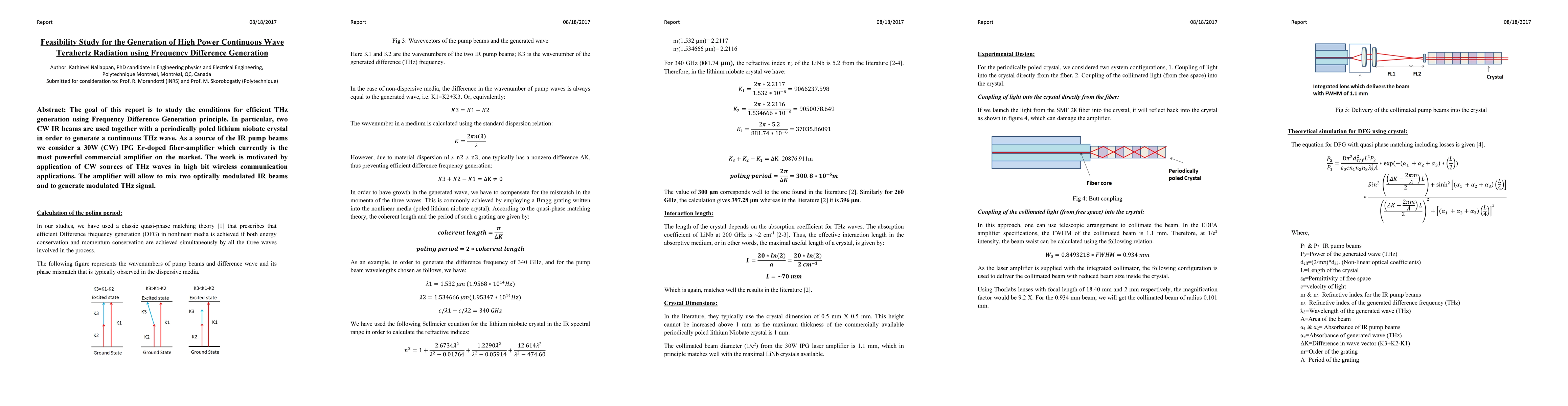 The goal of this report is to study the conditions for efficient THz generation using Frequency Difference Generation principle. In particular, two CW IR beams are used together with a periodically poled lithium niobate crystal in order to generate a continuous THz wave. As a source of the IR pump beams we consider a 30W (CW) IPG Er-doped fiber-amplifier which currently is the most powerful commercial amplifier on the market. The work is motivated by application of CW sources of THz waves in high bit wireless communication applications. The amplifier will allow to mix two optically modulated IR beams and to generate modulated THz signal.