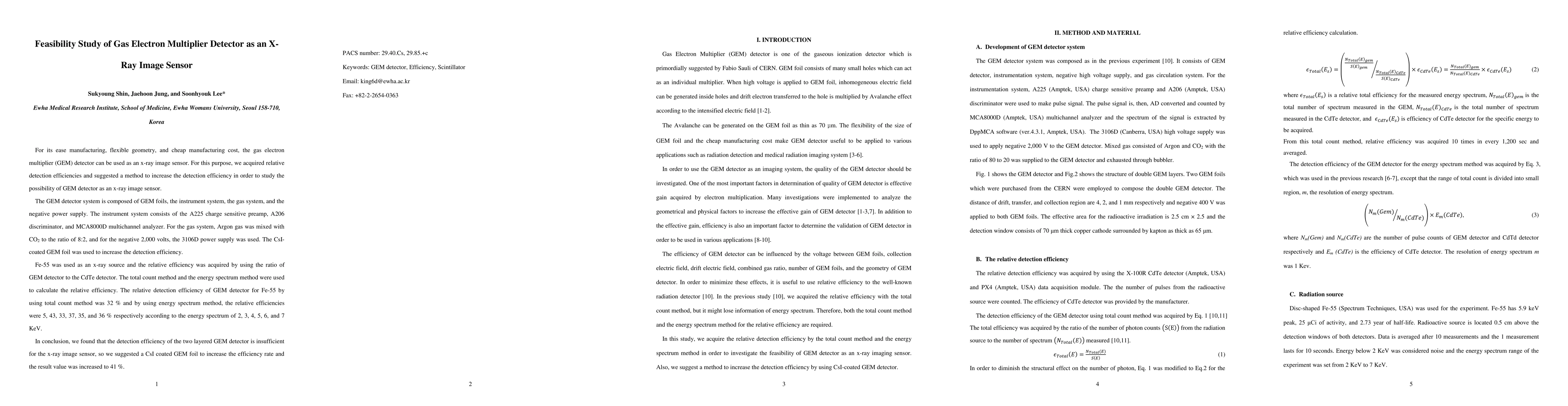 This study investigates the feasibility of using a gas electron multiplier (GEM) detector as an x-ray image sensor, finding its relative detection efficiency to be insufficient. The researchers suggest using a CsI-coated GEM foil to improve efficiency, which increased the detection rate to 41%.