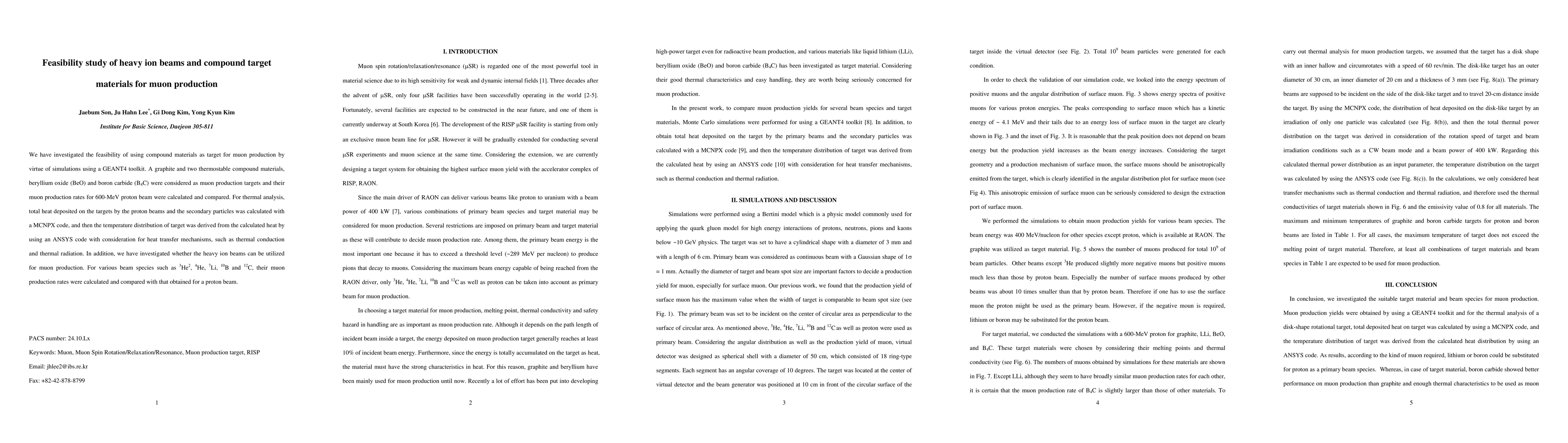 We have investigated the feasibility of using compound materials as target for muon production by virtue of simulations using a GEANT4 toolkit. A graphite and two thermostable compound materials, beryllium oxide (BeO) and boron carbide (B4C) were considered as muon production targets and their muon production rates for 600-MeV proton beam were calculated and compared. For thermal analysis, total heat deposited on the targets by the proton beams and the secondary particles was calculated with a MCNPX code, and then the temperature distribution of target was derived from the calculated heat by using an ANSYS code with consideration for heat transfer mechanisms, such as thermal conduction and thermal radiation. In addition, we have investigated whether the heavy ion beams can be utilized for muon production. For various beam species such as 3He2, 4He, 7Li, 10B and 12C, their muon production rates were calculated and compared with that obtained for a proton beam.