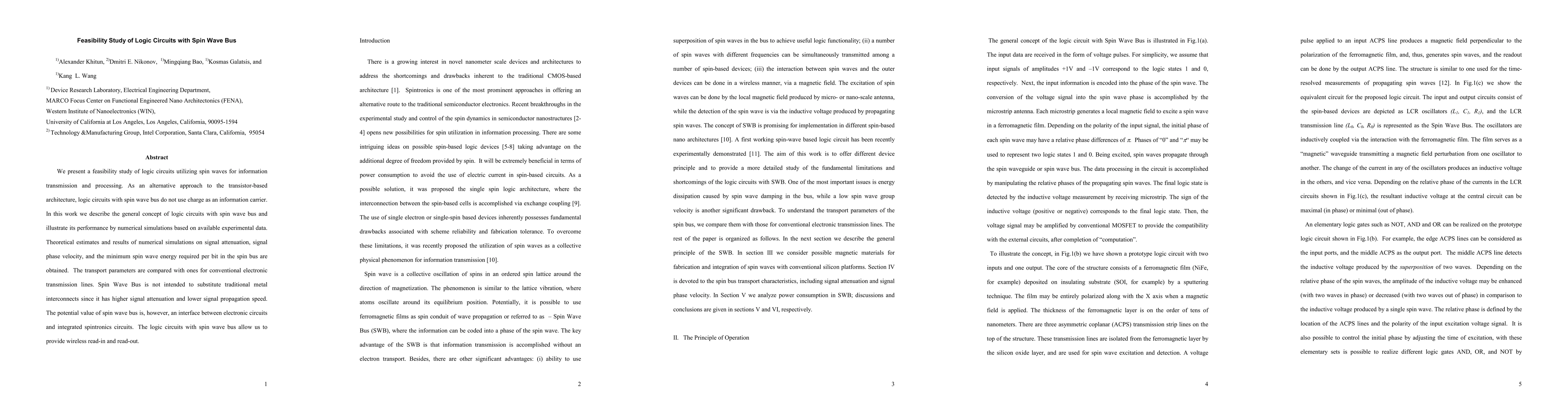This study explores the feasibility of logic circuits using spin waves for information transmission, presenting a concept that avoids charge-based information carriers. Numerical simulations indicate higher signal attenuation and slower propagation speeds compared to conventional electronic lines, but highlight its potential as an interface between electronic and spintronics circuits.