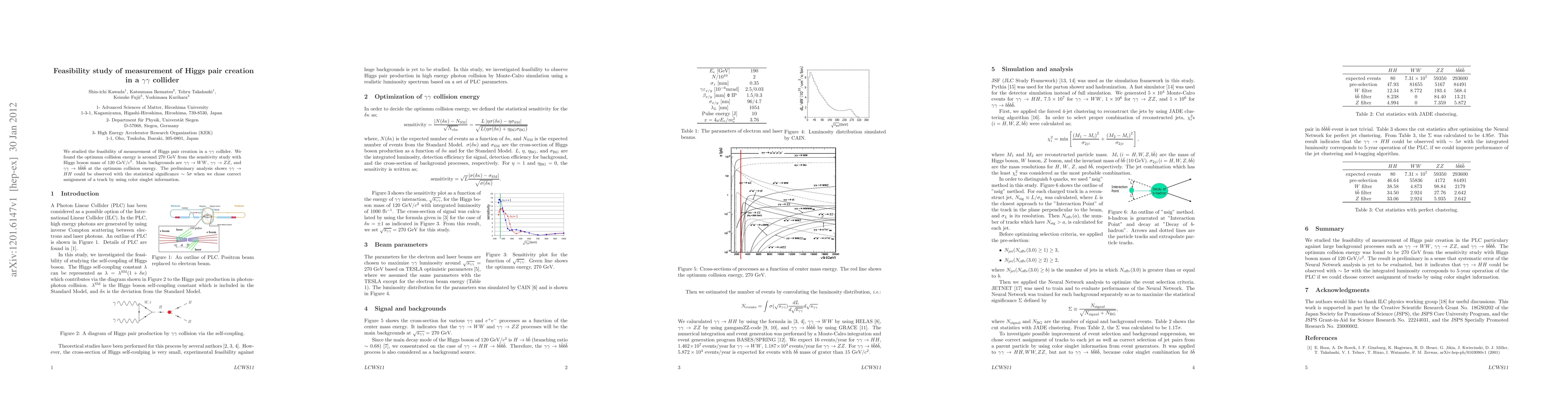 We studied the feasibility of measurement of Higgs pair creation in a gamma gamma collider. We found the optimum collision energy is around 270 GeV from the sensitivity study with Higgs boson mass of 120 GeV/c^2. Main backgrounds are gamma gamma to WW, gamma gamma to ZZ, and gamma gamma to bbbb at the optimum collision energy. The preliminary analysis shows HH could be observed with the statistical significance of about 5 sigma when we chose correct assignment of a track by using color singlet information.