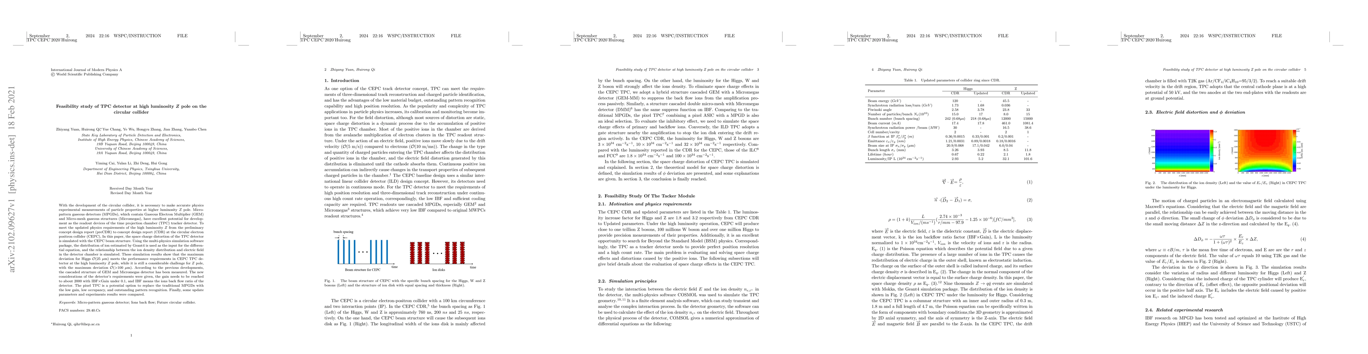 With the development of the circular collider, it is necessary to make accurate physics experimental measurements of particle properties at higher luminosity $Z$ pole. Micro-pattern gaseous detectors (MPGDs), which contain Gaseous Electron Multiplier (GEM) and Micro-mesh gaseous structures (Micromegas), have excellent potential for development as the readout devices of the time projection chamber (TPC) tracker detector. To meet the updated physics requirements of the high luminosity $Z$ from the preliminary concept design report (preCDR) to concept design report (CDR) at the circular electron positron collider (CEPC), In this paper, the space charge distortion of the TPC detector is simulated with the CEPC beam structure. Using the multi-physics simulation software package, the distribution of ion estimated by Geant4 is used as the input for the differential equation, and the relationship between the ion density distribution and electric field in the detector chamber is simulated. These simulation results show that the maximum deviation for Higgs $\mathcal{O}$(25 $\mu$m) meets the performance requirements in CEPC TPC detector at the high luminosity $Z$ pole, while it is still a considerable challenge for $Z$ pole, with the maximum deviation $\mathcal{O}$($>100~\mu$m). According to the previous developments, the cascaded structure of GEM and Micromegas detector has been measured. The new considerations of the detector's requirements were given, the gain needs to be reached to about 2000 with IBF$\times$Gain under 0.1, and IBF means the ions back flow ratio of the detector. The pixel TPC is a potential option to replace the traditional MPGDs with the low gain, low occupancy, and outstanding pattern recognition. Finally, some update parameters and experiments results were compared.