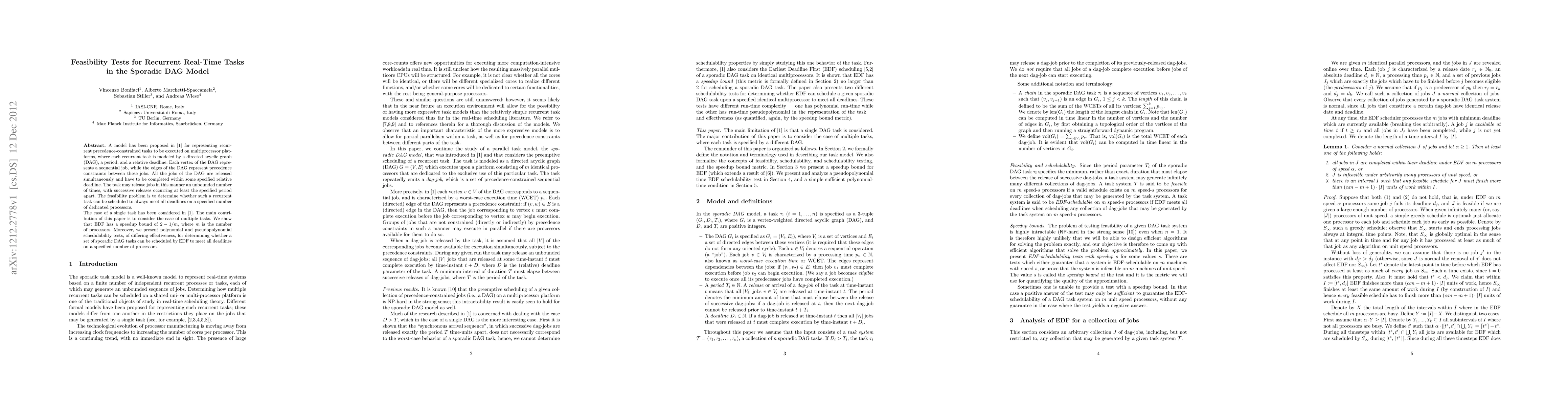 This paper extends the feasibility tests for scheduling recurrent precedence-constrained tasks modeled as sporadic DAGs on multiprocessor platforms. It introduces polynomial and pseudopolynomial schedulability tests for determining if multiple such tasks can be scheduled by EDF to meet deadlines, with a speedup bound of 2-1/m for m processors.