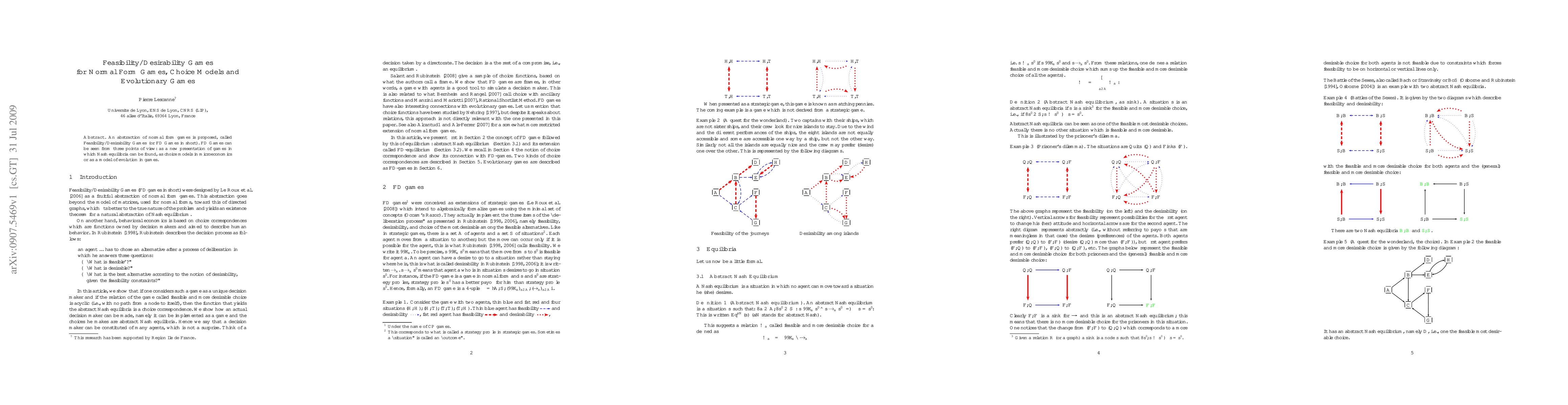 Summary: This paper introduces Feasibility/Desirability Games (FD Games), a novel abstraction of normal form games that can represent Nash equilibria, choice models in microeconomics, and evolutionary game dynamics. FD Games provide a versatile framework for analyzing strategic interactions across different contexts.