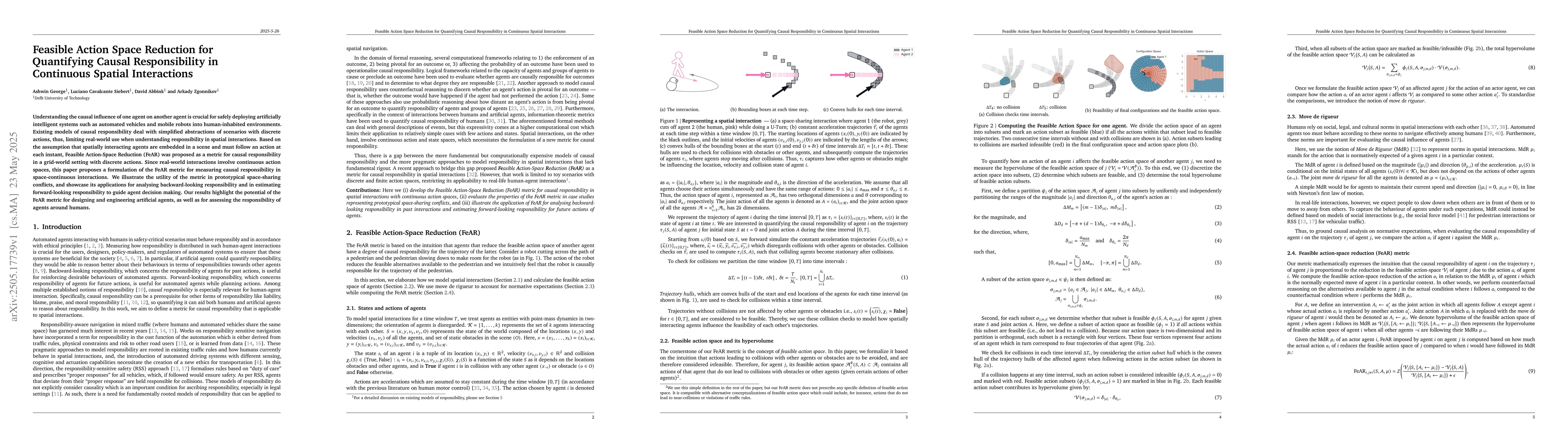 The paper proposes Feasible Action-Space Reduction (FeAR) for quantifying causal responsibility in continuous spatial interactions, extending the previous grid-world setting with discrete actions.