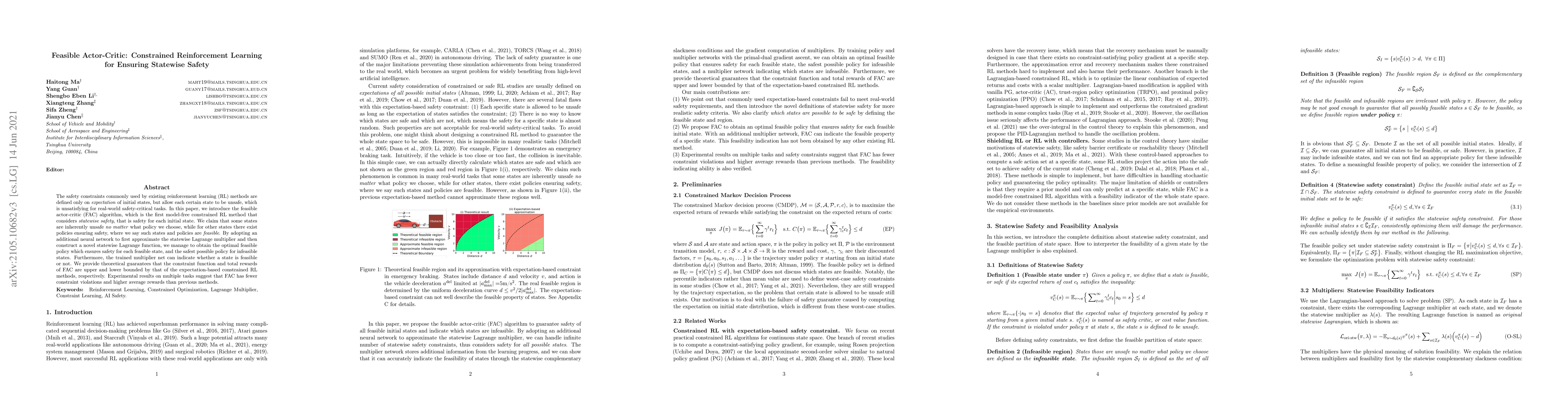 The Feasible Actor-Critic (FAC) algorithm is a novel model-free constrained reinforcement learning method that ensures statewise safety for each initial state, addressing limitations of expectation-based methods. It optimizes for the safest possible policy for feasible states and provides theoretical guarantees of superior performance over traditional methods.