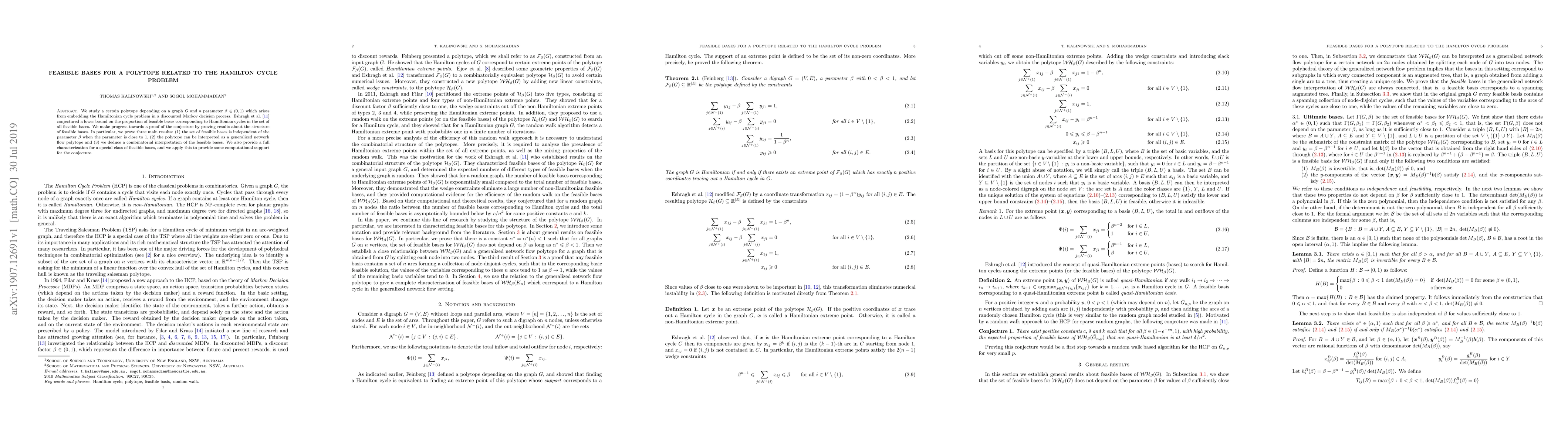 We study a certain polytope depending on a graph $G$ and a parameter $\beta\in(0,1)$ which arises from embedding the Hamiltonian cycle problem in a discounted Markov decision process. Eshragh \emph{et al.} conjectured a lower bound on the proportion of feasible bases corresponding to Hamiltonian cycles in the set of all feasible bases. We make progress towards a proof of the conjecture by proving results about the structure of feasible bases. In particular, we prove three main results: (1) the set of feasible bases is independent of the parameter $\beta$ when the parameter is close to 1, (2) the polytope can be interpreted as a generalized network flow polytope and (3) we deduce a combinatorial interpretation of the feasible bases. We also provide a full characterization for a special class of feasible bases, and we apply this to provide some computational support for the conjecture.