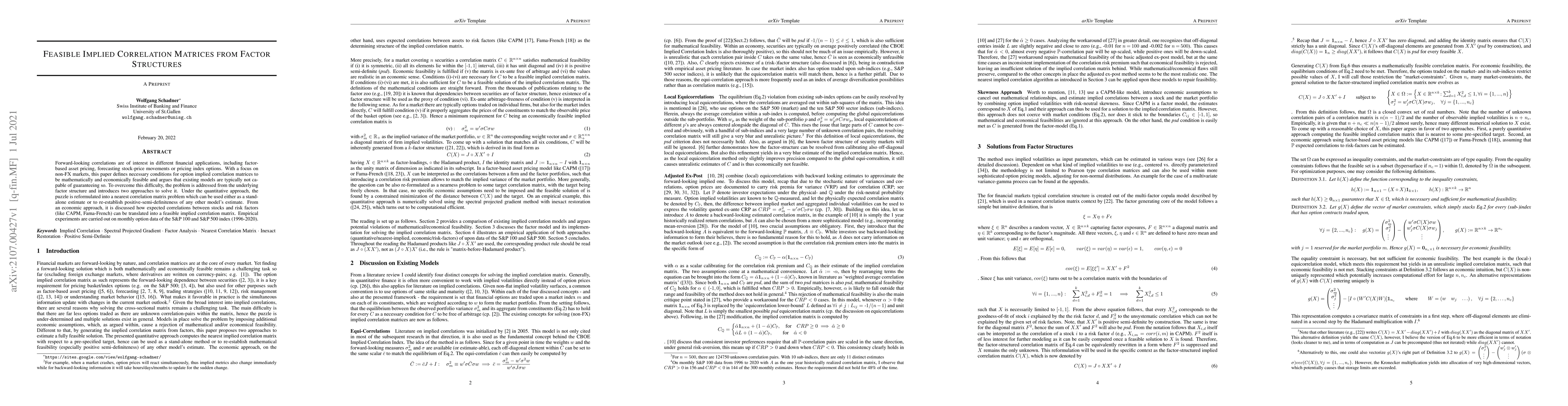 This paper explores the construction of feasible implied correlation matrices from factor structures, addressing the limitations of existing models in ensuring mathematical and economic feasibility. It proposes two approaches: a quantitative method reformulating the problem into a nearest correlation matrix, and an economic approach translating expected correlations between stocks and risk factors into feasible matrices, validated through empirical analysis on S&P 100 and S&P 500 index option data.