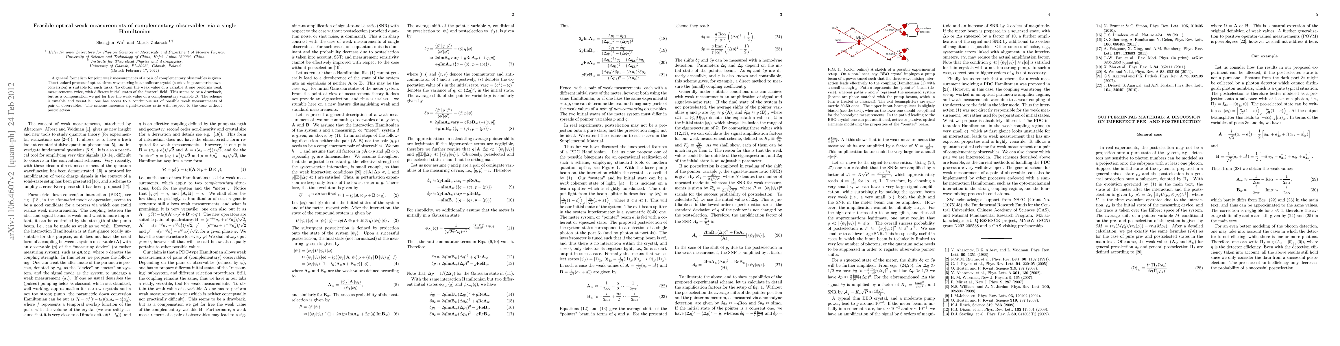A general formalism for joint weak measurements of a pair of complementary observables is given. The standard process of optical three-wave mixing in a nonlinear crystal (such as in parametric down-conversion) is suitable for such tasks. To obtain the weak value of a variable $A$ one performs weak measurements twice, with different initial states of the "meter" field. This seems to be a drawback, but as a compensation we get for free the weak value of a complementary variable $B$. The scheme is tunable and versatile: one has access to a continuous set of possible weak measurements of pair of observables. The scheme increases signal-to-noise ratio with respect to the case without postselection.