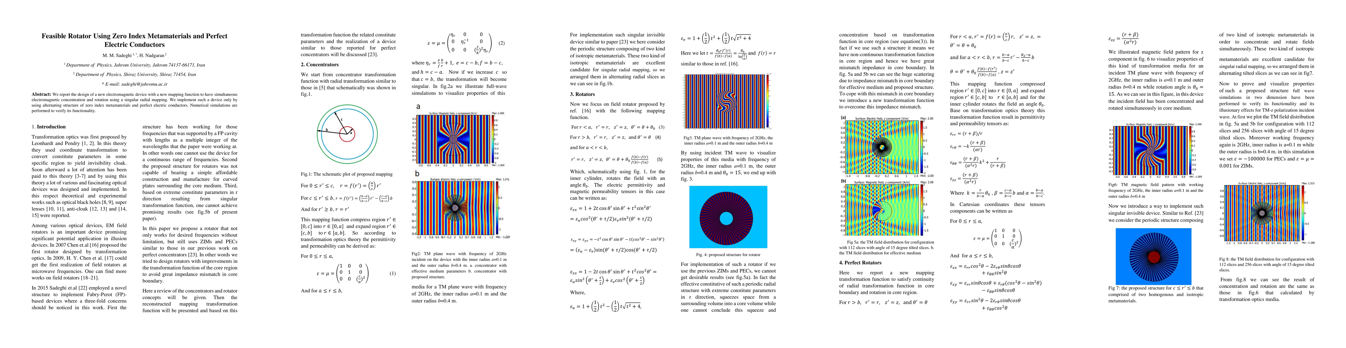 Summary: This paper introduces a novel electromagnetic device utilizing zero index metamaterials and perfect electric conductors to achieve simultaneous electromagnetic concentration and rotation through a singular radial mapping function, verified by numerical simulations.