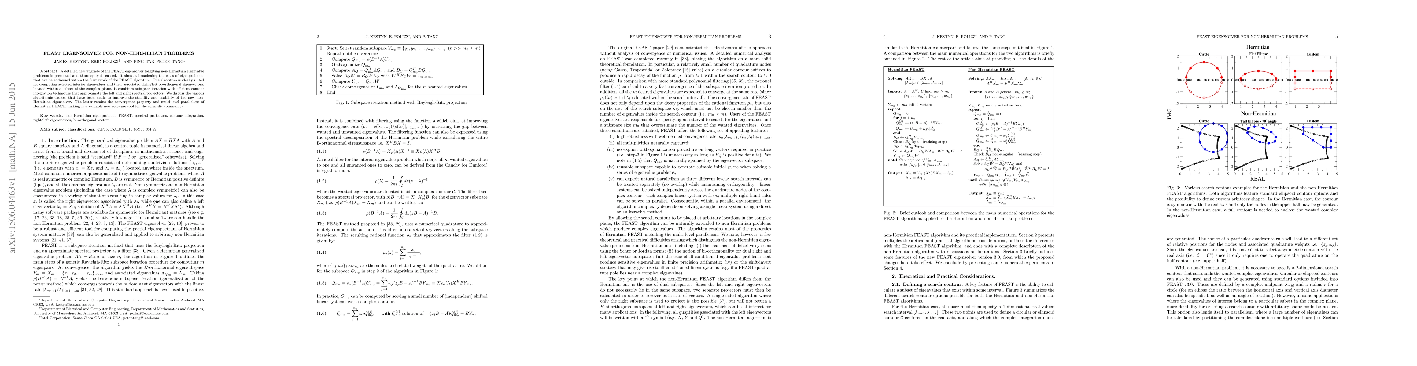 The FEAST eigensolver has been upgraded to address non-Hermitian eigenvalue problems, combining subspace iteration with contour integration techniques to compute interior eigenvalues and bi-orthogonal eigenvectors. This new version maintains the stability, usability, and parallel capabilities of its Hermitian counterpart, enhancing its value for scientific research.