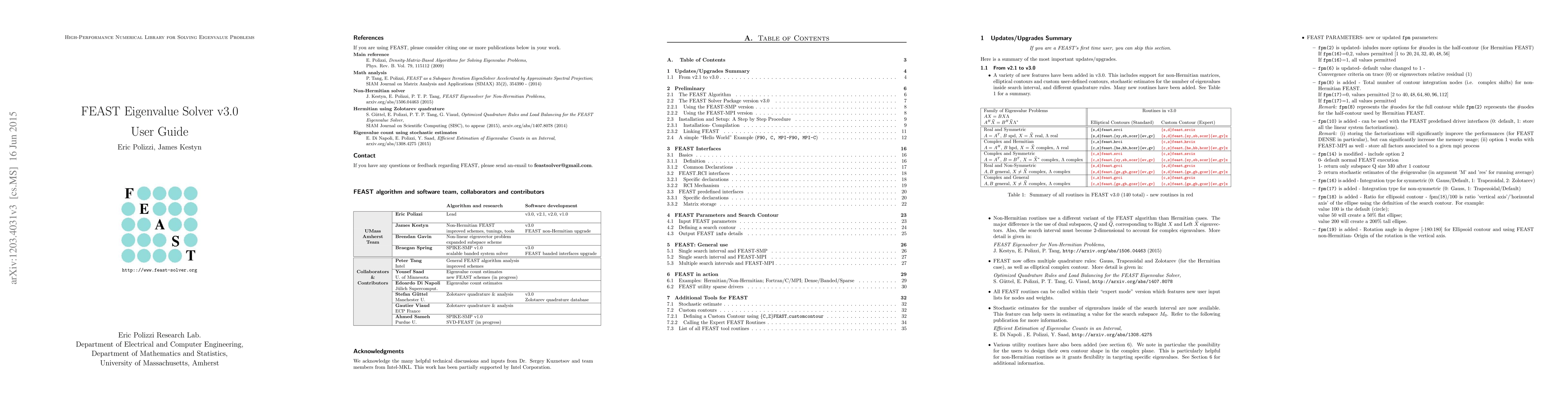 The FEAST eigensolver v3.0 is a high-performance library for solving Hermitian and non-Hermitian eigenvalue problems using the FEAST algorithm, offering robustness, accuracy, and scalability on parallel architectures. This user guide provides installation instructions, detailed interface descriptions, and numerous examples.