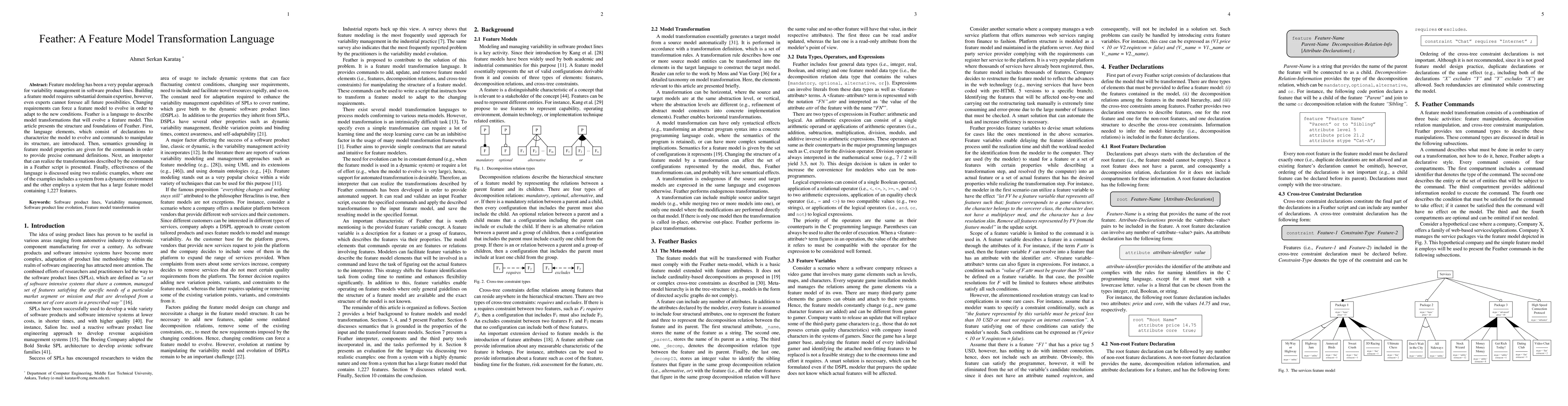 Feature modeling has been a very popular approach for variability management in software product lines. Building a feature model requires substantial domain expertise, however, even experts cannot foresee all future possibilities. Changing requirements can force a feature model to evolve in order to adapt to the new conditions. Feather is a language to describe model transformations that will evolve a feature model. This article presents the structure and foundations of Feather. First, the language elements, which consist of declarations to characterize the model to evolve and commands to manipulate its structure, are introduced. Then, semantics grounding in feature model properties are given for the commands in order to provide precise command definitions. Next, an interpreter that can realize the transformations described by the commands in a Feather script is presented. Finally, effectiveness of the language is discussed using two realistic examples, where one of the examples includes a system from a dynamic environment and the other employs a system that has a large feature model containing 1,227 features.