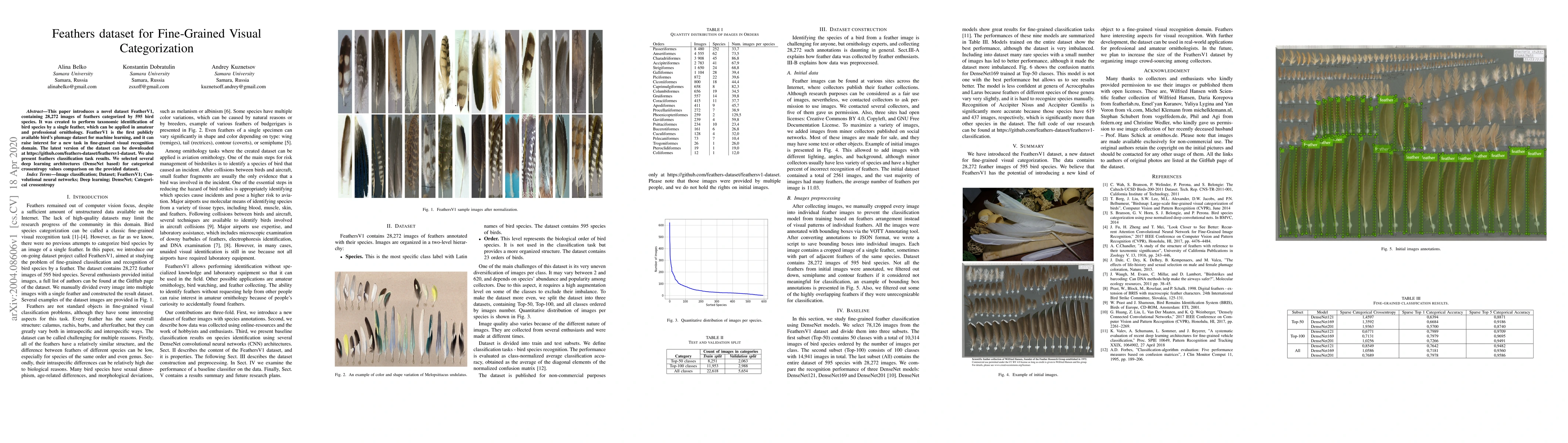 This paper introduces FeatherV1, a new dataset of 28,272 feather images categorized by 595 bird species, aimed at taxonomic identification of bird species via feather analysis. The dataset is publicly available and includes results from DenseNet-based deep learning models for fine-grained visual recognition.