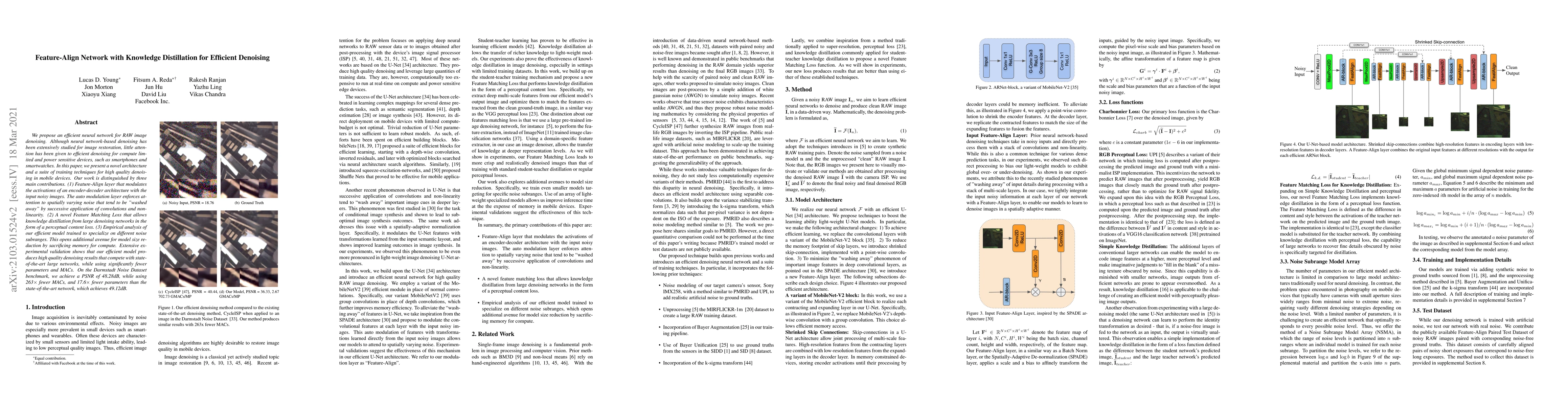 We propose an efficient neural network for RAW image denoising. Although neural network-based denoising has been extensively studied for image restoration, little attention has been given to efficient denoising for compute limited and power sensitive devices, such as smartphones and smartwatches. In this paper, we present a novel architecture and a suite of training techniques for high quality denoising in mobile devices. Our work is distinguished by three main contributions. (1) Feature-Align layer that modulates the activations of an encoder-decoder architecture with the input noisy images. The auto modulation layer enforces attention to spatially varying noise that tend to be "washed away" by successive application of convolutions and non-linearity. (2) A novel Feature Matching Loss that allows knowledge distillation from large denoising networks in the form of a perceptual content loss. (3) Empirical analysis of our efficient model trained to specialize on different noise subranges. This opens additional avenue for model size reduction by sacrificing memory for compute. Extensive experimental validation shows that our efficient model produces high quality denoising results that compete with state-of-the-art large networks, while using significantly fewer parameters and MACs. On the Darmstadt Noise Dataset benchmark, we achieve a PSNR of 48.28dB, while using 263 times fewer MACs, and 17.6 times fewer parameters than the state-of-the-art network, which achieves 49.12dB.