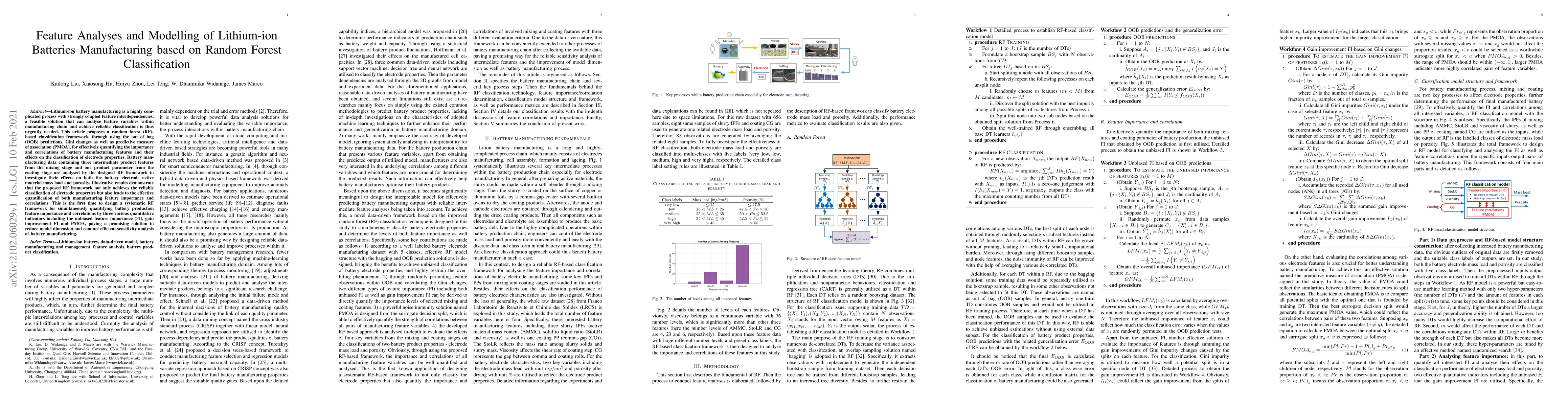 Lithium-ion battery manufacturing is a highly complicated process with strongly coupled feature interdependencies, a feasible solution that can analyse feature variables within manufacturing chain and achieve reliable classification is thus urgently needed. This article proposes a random forest (RF)-based classification framework, through using the out of bag (OOB) predictions, Gini changes as well as predictive measure of association (PMOA), for effectively quantifying the importance and correlations of battery manufacturing features and their effects on the classification of electrode properties. Battery manufacturing data containing three intermediate product features from the mixing stage and one product parameter from the coating stage are analysed by the designed RF framework to investigate their effects on both the battery electrode active material mass load and porosity. Illustrative results demonstrate that the proposed RF framework not only achieves the reliable classification of electrode properties but also leads to the effective quantification of both manufacturing feature importance and correlations. This is the first time to design a systematic RF framework for simultaneously quantifying battery production feature importance and correlations by three various quantitative indicators including the unbiased feature importance (FI), gain improvement FI and PMOA, paving a promising solution to reduce model dimension and conduct efficient sensitivity analysis of battery manufacturing.
