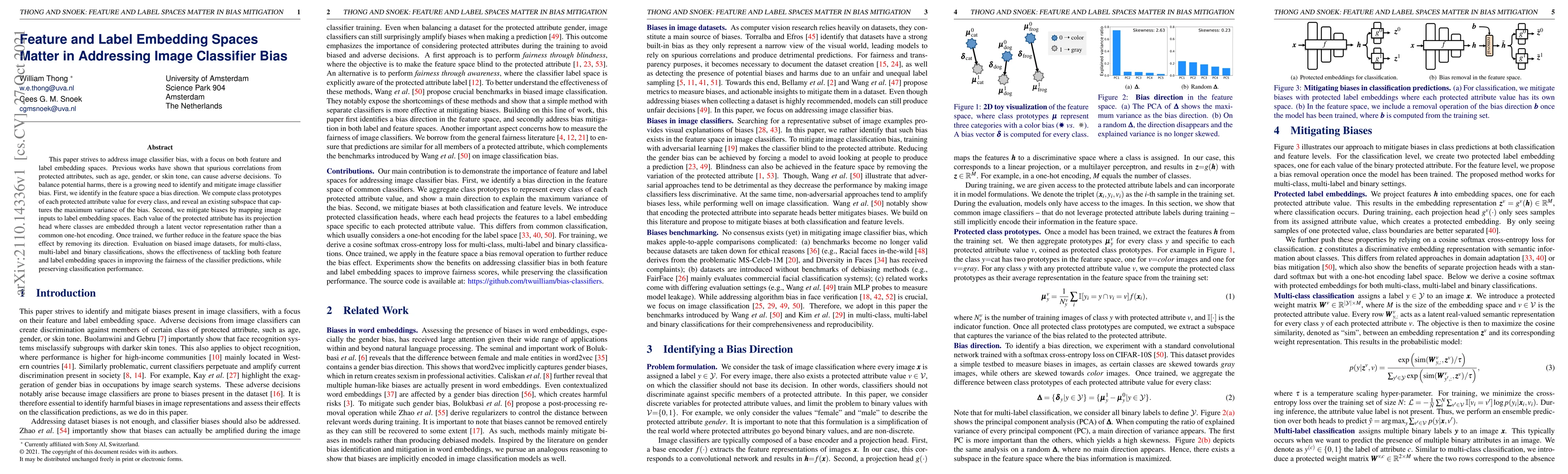 This paper addresses image classifier bias by identifying and mitigating subspace biases in both feature and label embedding spaces. It shows improvement in fairness while preserving classification performance across multi-class, multi-label, and binary classifications.