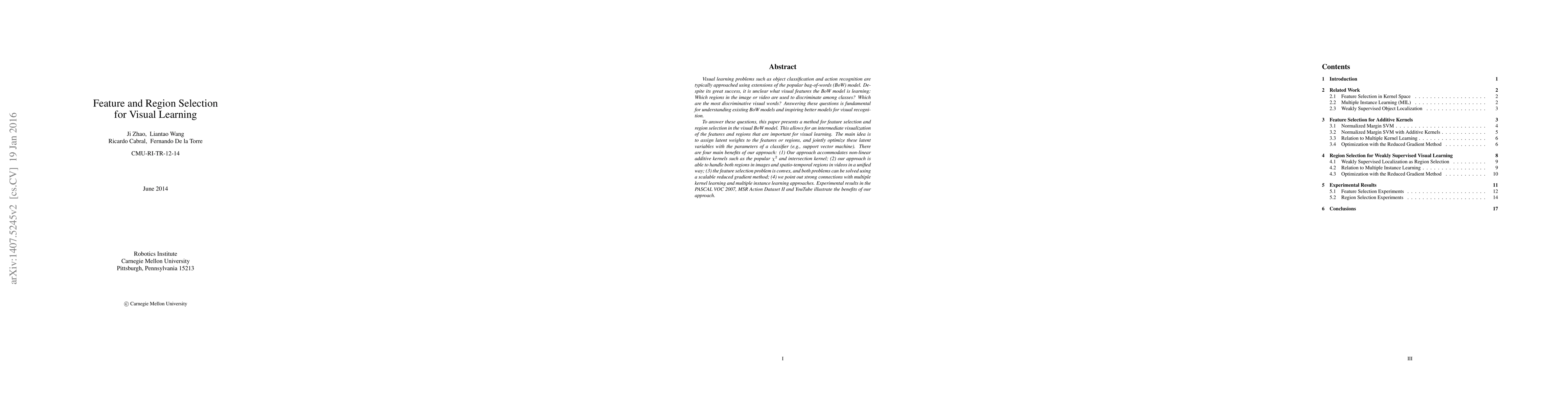 Visual learning problems such as object classification and action recognition are typically approached using extensions of the popular bag-of-words (BoW) model. Despite its great success, it is unclear what visual features the BoW model is learning: Which regions in the image or video are used to discriminate among classes? Which are the most discriminative visual words? Answering these questions is fundamental for understanding existing BoW models and inspiring better models for visual recognition. To answer these questions, this paper presents a method for feature selection and region selection in the visual BoW model. This allows for an intermediate visualization of the features and regions that are important for visual learning. The main idea is to assign latent weights to the features or regions, and jointly optimize these latent variables with the parameters of a classifier (e.g., support vector machine). There are four main benefits of our approach: (1) Our approach accommodates non-linear additive kernels such as the popular $\chi^2$ and intersection kernel; (2) our approach is able to handle both regions in images and spatio-temporal regions in videos in a unified way; (3) the feature selection problem is convex, and both problems can be solved using a scalable reduced gradient method; (4) we point out strong connections with multiple kernel learning and multiple instance learning approaches. Experimental results in the PASCAL VOC 2007, MSR Action Dataset II and YouTube illustrate the benefits of our approach.