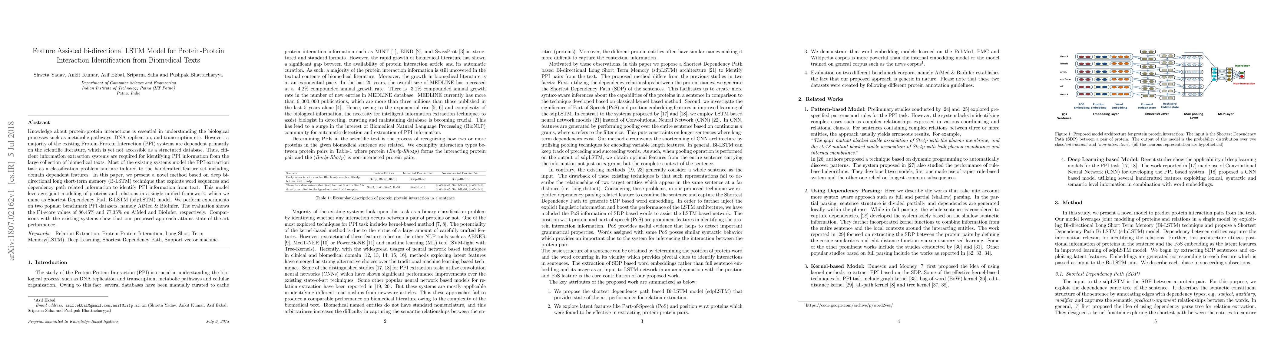 This paper introduces a novel bi-directional LSTM model named sdpLSTM for identifying protein-protein interactions from biomedical texts, achieving state-of-the-art performance with F1-scores of 86.45% and 77.35% on AiMed and BioInfer datasets, respectively. The model leverages deep learning to extract features from word sequences and dependency paths, surpassing existing handcrafted feature-based systems.