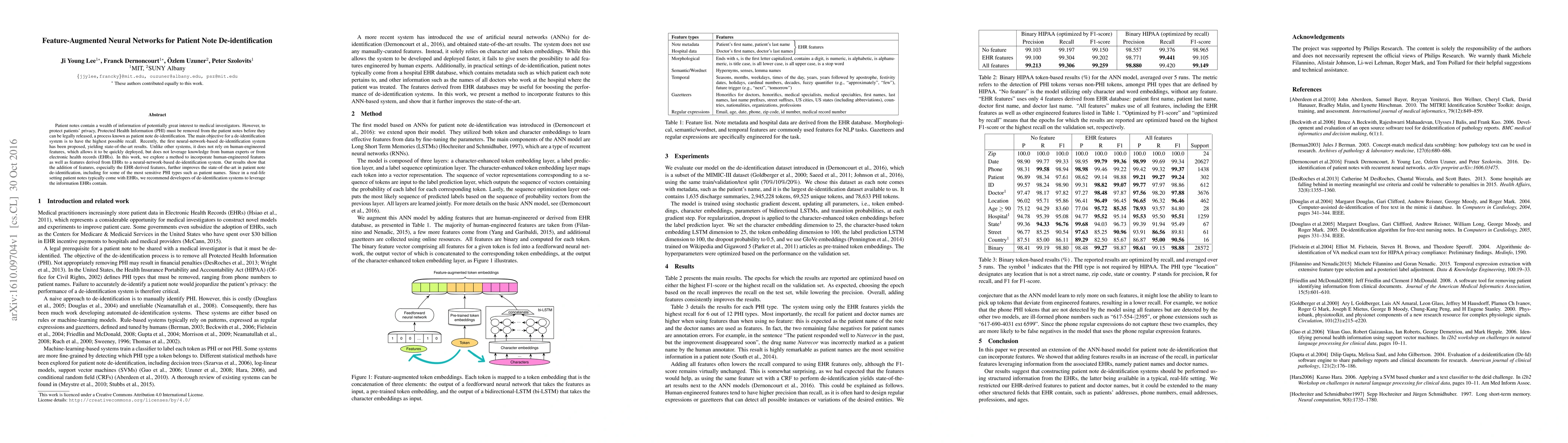 This paper proposes a feature-augmented neural network for patient note de-identification, incorporating both human-engineered features and EHR-derived features to enhance recall. The results show significant improvements in de-identification performance, especially for sensitive PHI types, recommending the use of EHR information in real-life applications.