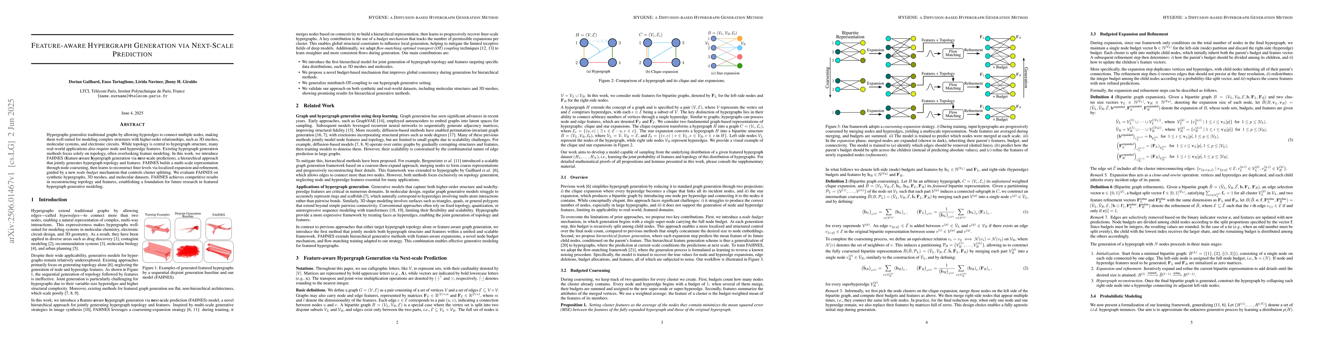Hypergraphs generalize traditional graphs by allowing hyperedges to connect multiple nodes, making them well-suited for modeling complex structures with higher-order relationships, such as 3D meshes, molecular systems, and electronic circuits. While topology is central to hypergraph structure, many real-world applications also require node and hyperedge features. Existing hypergraph generation methods focus solely on topology, often overlooking feature modeling. In this work, we introduce FAHNES (feature-aware hypergraph generation via next-scale prediction), a hierarchical approach that jointly generates hypergraph topology and features. FAHNES builds a multi-scale representation through node coarsening, then learns to reconstruct finer levels via localized expansion and refinement, guided by a new node budget mechanism that controls cluster splitting. We evaluate FAHNES on synthetic hypergraphs, 3D meshes, and molecular datasets. FAHNES achieves competitive results in reconstructing topology and features, establishing a foundation for future research in featured hypergraph generative modeling.