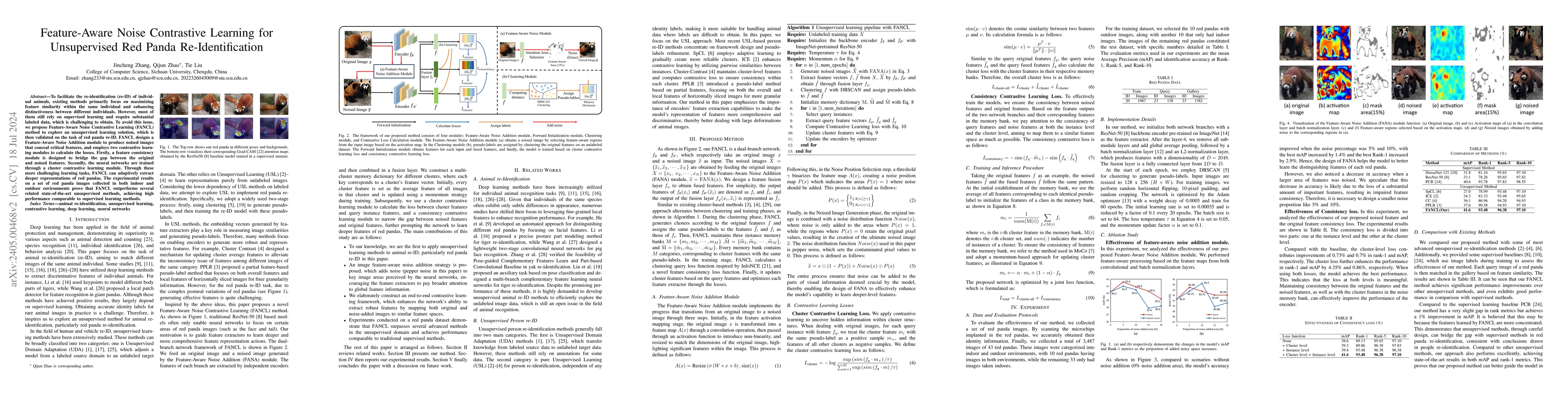 The paper proposes Feature-Aware Noise Contrastive Learning (FANCL) for unsupervised red panda re-identification, employing noise addition and contrastive learning modules to adaptively extract deeper representations without requiring labeled data. Experimental results show FANCL outperforms other unsupervised methods, achieving performance comparable to supervised techniques.