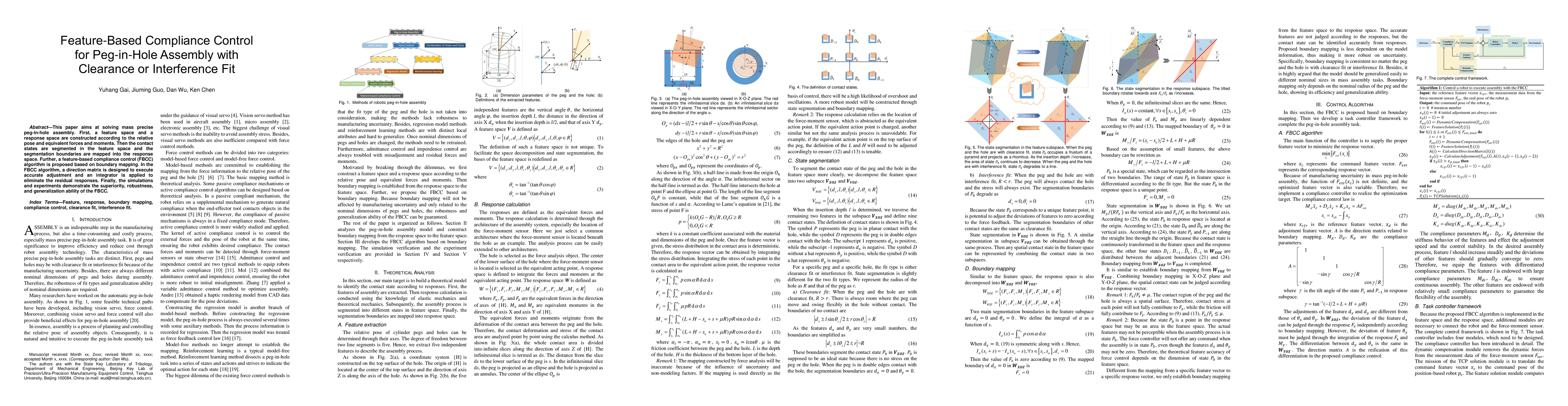 This paper aims at solving mass precise peg-in-hole assembly. First, a feature space and a response space are constructed according to the relative pose and equivalent forces and moments. Then the contact states are segmented in the feature space and the segmentation boundaries are mapped into the response space. Further, a feature-based compliance control (FBCC) algorithm is proposed based on boundary mapping. In the FBCC algorithm, a direction matrix is designed to execute accurate adjustment and an integrator is applied to eliminate the residual responses. Finally, the simulations and experiments demonstrate the superiority, robustness, and generalization ability of the FBCC.