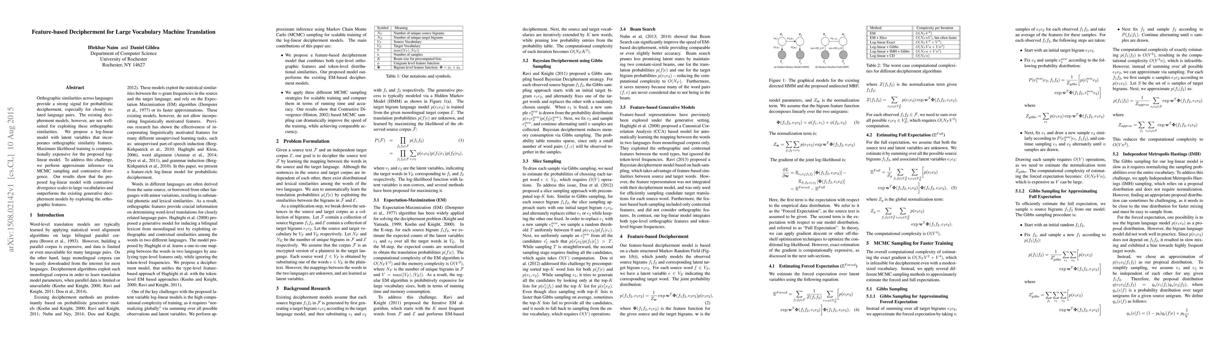 A new machine translation model uses orthographic similarities to improve decipherment, outperforming existing models with large vocabularies, and employs approximate inference techniques for efficient training.