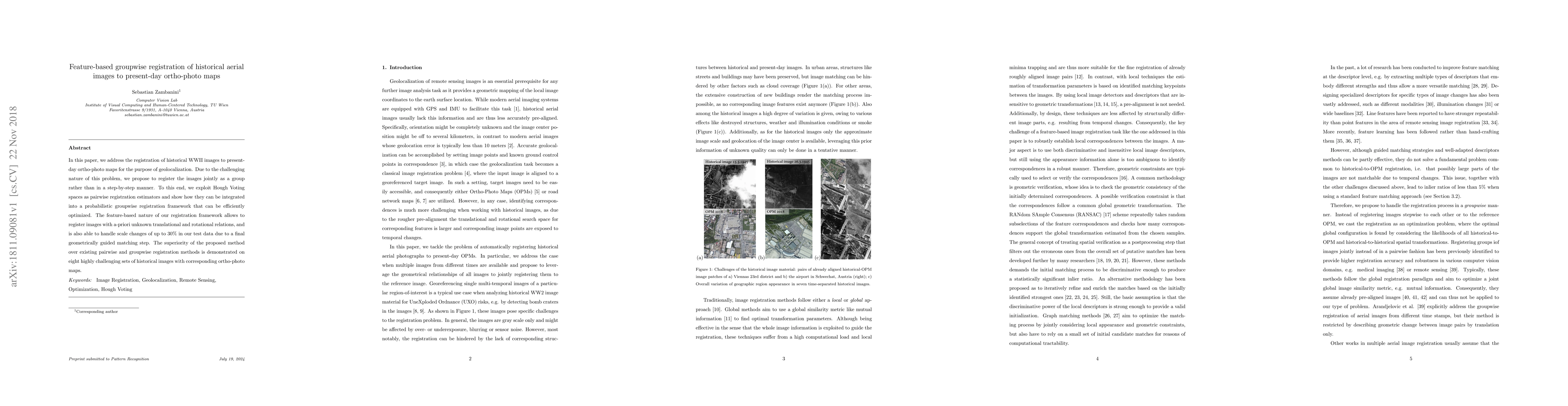 This paper proposes a feature-based groupwise registration method for aligning WWII historical aerial images with present-day ortho-photo maps, leveraging Hough Voting spaces and a probabilistic framework for efficient optimization. The method demonstrates superior performance in handling unknown translational, rotational, and scale changes compared to existing registration techniques.