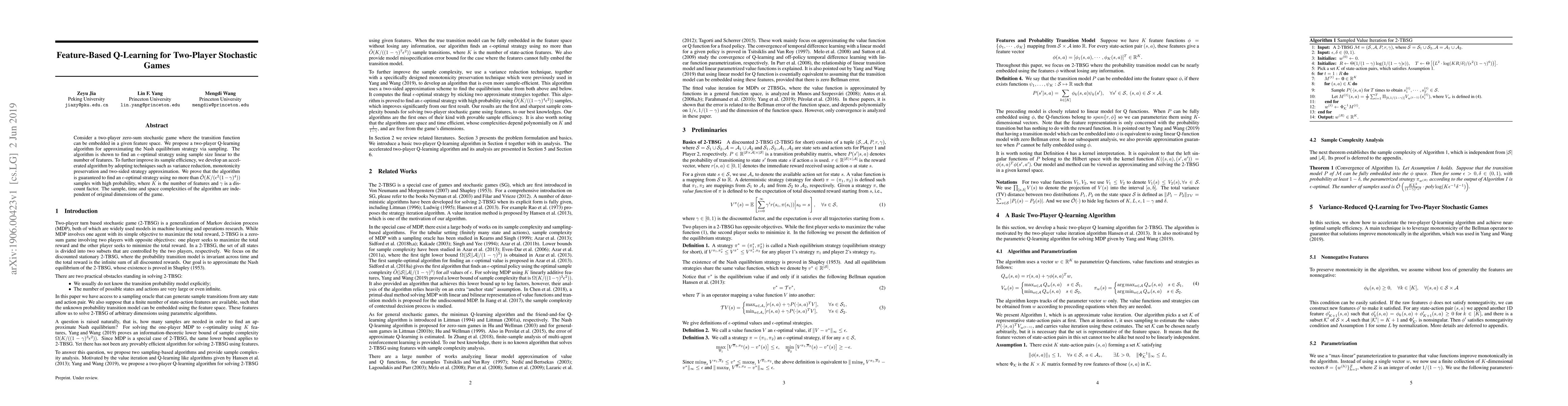 This paper proposes a two-player Q-learning algorithm for stochastic games that approximates the Nash equilibrium using feature-based sampling. The algorithm achieves $\epsilon$-optimal strategies with sample complexity linear to the number of features, and an accelerated version further improves sample efficiency.