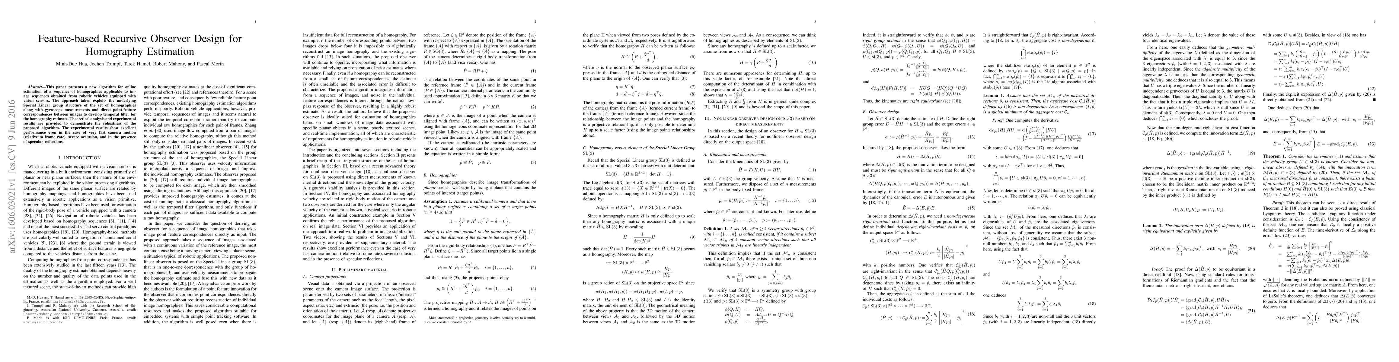 This paper presents a new algorithm for online estimation of a sequence of homographies applicable to image sequences obtained from robotic vehicles equipped with vision sensors. The approach taken exploits the underlying Special Linear group structure of the set of homographies along with gyroscope measurements and direct point-feature correspondences between images to develop temporal filter for the homography estimate. Theoretical analysis and experimental results are provided to demonstrate the robustness of the proposed algorithm. The experimental results show excellent performance even in the case of very fast camera motion (relative to frame rate), severe occlusion, and in the presence of specular reflections.
