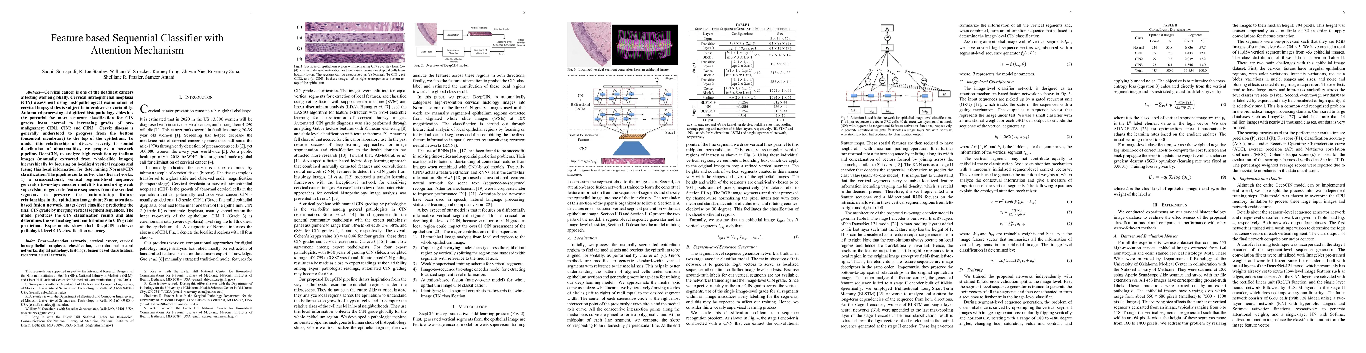 The paper proposes DeepCIN, a network pipeline for automated cervical intraepithelial neoplasia (CIN) classification using digitized histopathology slides, employing a two-stage encoder model and an attention-based fusion network to analyze vertical segments of epithelium images for accurate CIN grading. DeepCIN achieves pathologist-level classification accuracy.