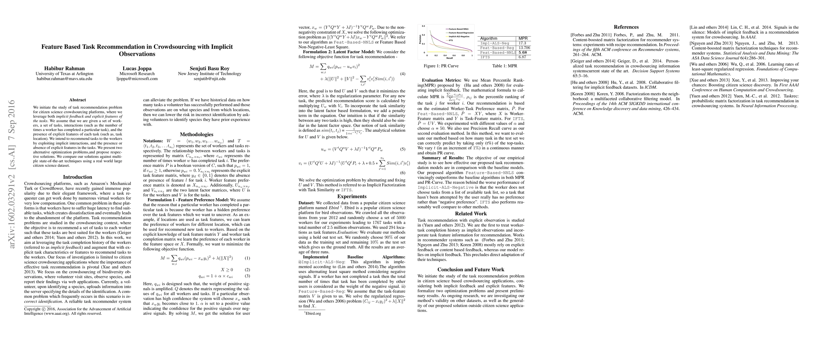 This paper proposes a method for task recommendation in crowdsourcing that utilizes both implicit feedback from worker interactions and explicit task features. The authors formulate the problem as an optimization task and present two solution approaches, comparing their performance against state-of-the-art techniques using real-world datasets.