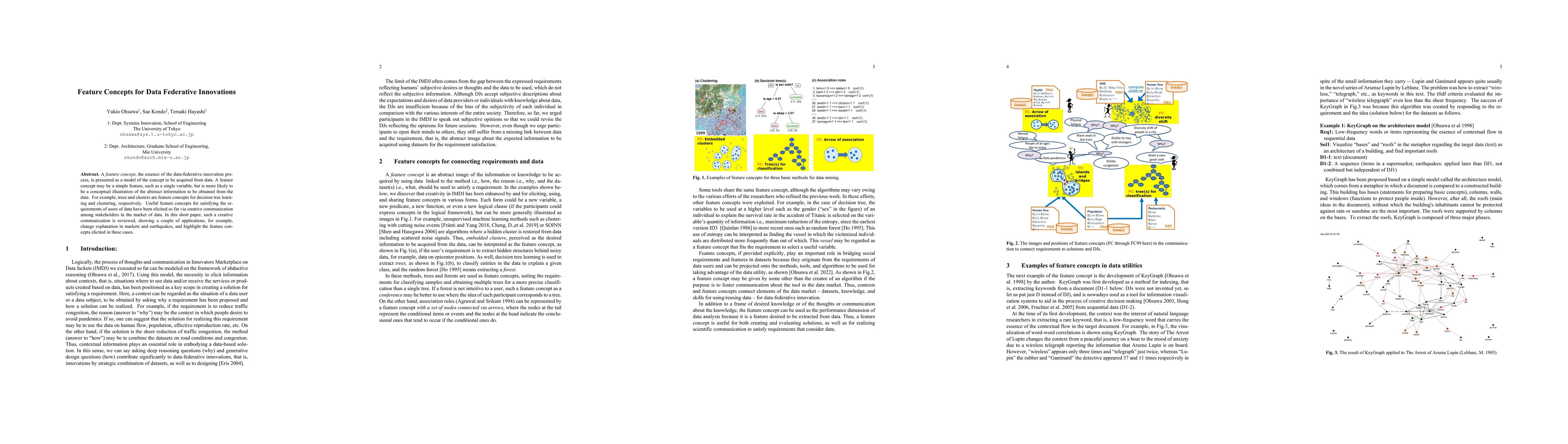 A feature concept, the essence of the data-federative innovation process, is presented as a model of the concept to be acquired from data. A feature concept may be a simple feature, such as a single variable, but is more likely to be a conceptual illustration of the abstract information to be obtained from the data. For example, trees and clusters are feature concepts for decision tree learning and clustering, respectively. Useful feature concepts for satis-fying the requirements of users of data have been elicited so far via creative communication among stakeholders in the market of data. In this short paper, such a creative communication is reviewed, showing a couple of appli-cations, for example, change explanation in markets and earthquakes, and highlight the feature concepts elicited in these cases.