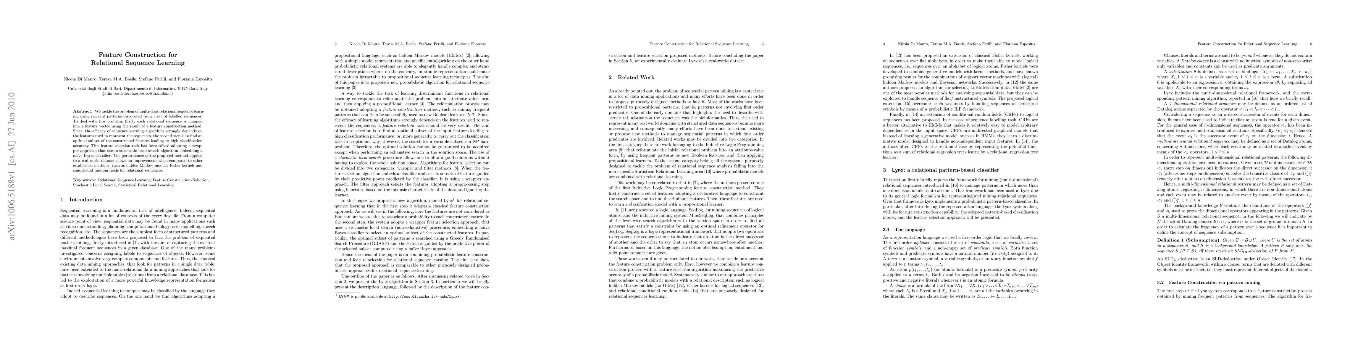 This paper proposes a method for multi-class relational sequence learning by constructing feature vectors from labelled sequences and selecting optimal features using a wrapper approach with a stochastic local search algorithm and naive Bayes classifier. The method demonstrates improved performance over established techniques like hidden Markov models and conditional random fields.