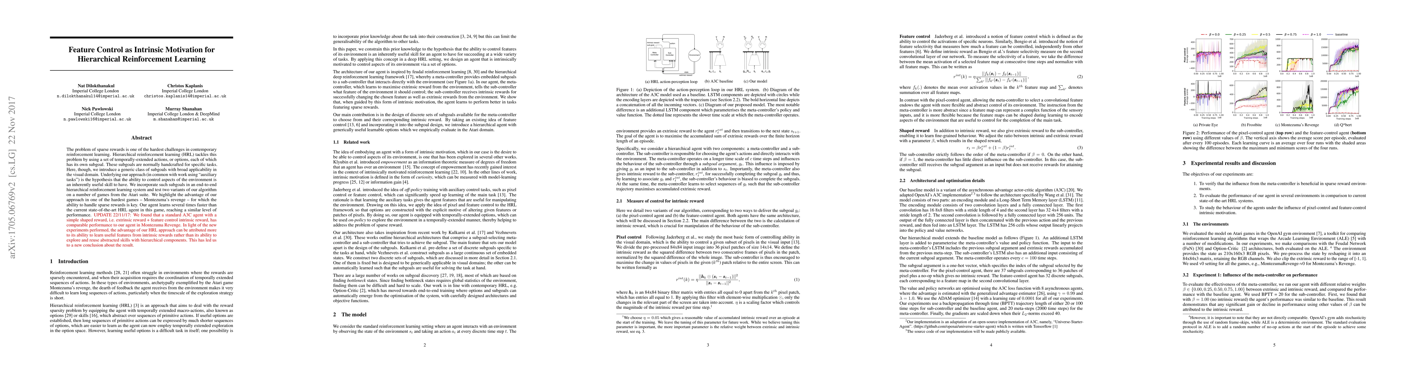 This paper proposes a hierarchical reinforcement learning approach that uses intrinsic rewards based on feature control to tackle sparse reward problems. The method learns subgoals that enable the agent to control aspects of the environment, leading to faster learning in games like Montezuma's Revenge. Subsequent experiments reveal that the intrinsic feature control reward is more influential than the hierarchical structure in achieving performance gains.