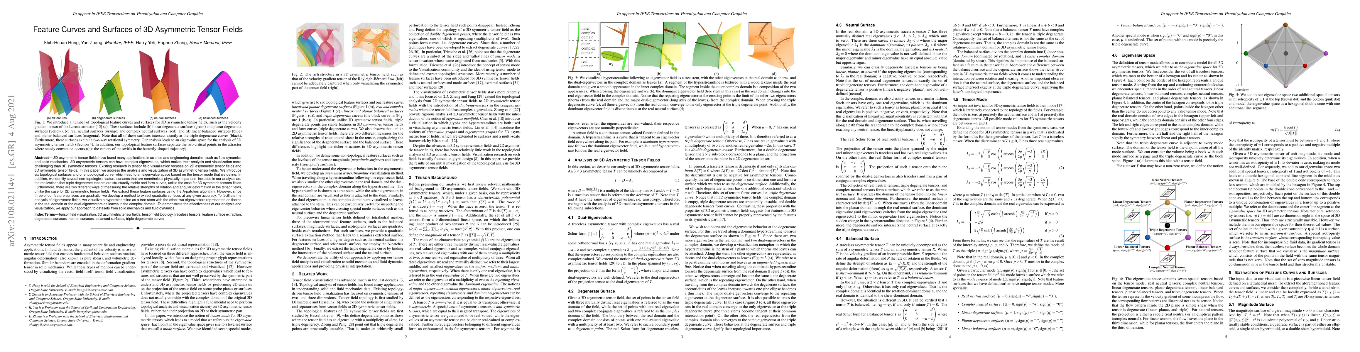 This paper introduces novel topological and non-topological feature surfaces and curves for analyzing and visualizing 3D asymmetric tensor fields, including the extraction of quadratic surfaces using a new method. It also presents a unique visualization technique for hyperstreamlines and applies the approach to solid mechanics and fluid dynamics datasets.