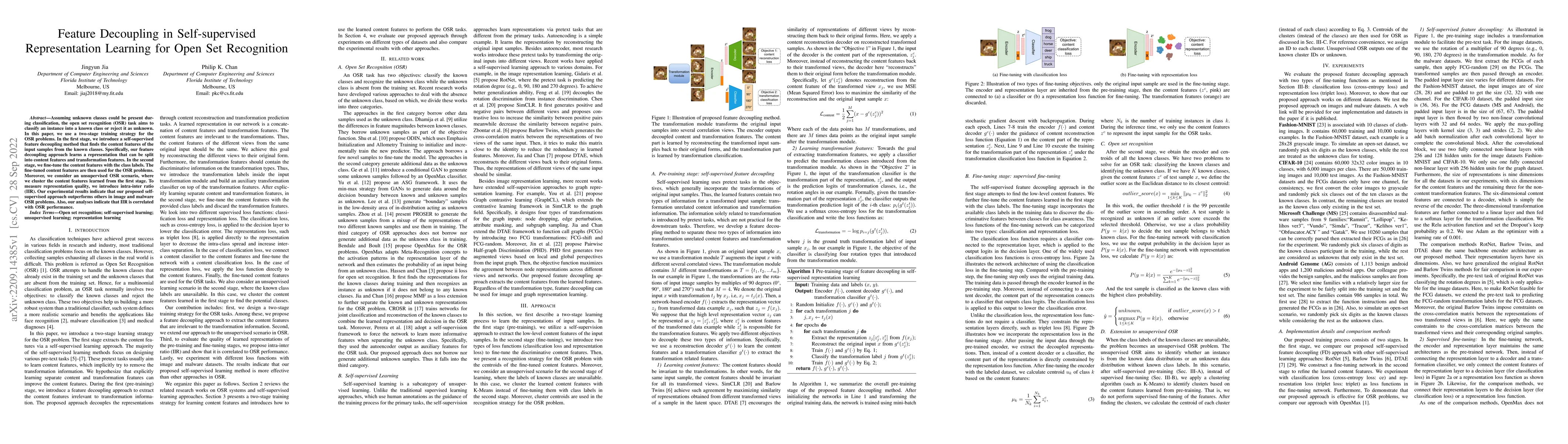This paper proposes a self-supervised feature decoupling method for open set recognition (OSR) that separates content and transformation features, followed by fine-tuning content features with class labels. The intra-inter ratio (IIR) is introduced to measure representation quality, showing improved performance in image and malware OSR tasks.