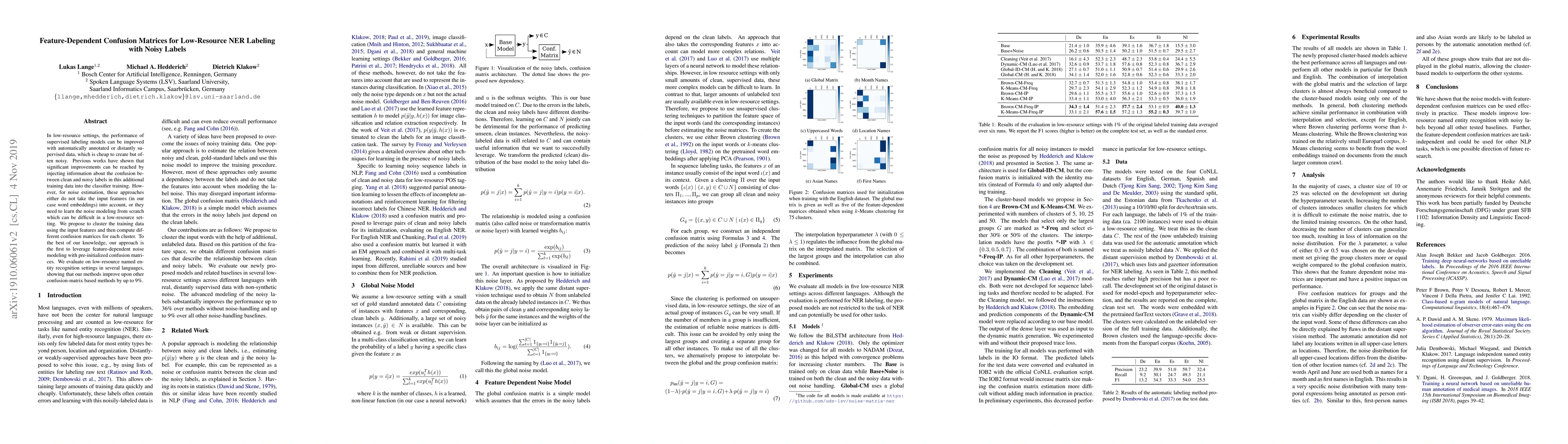 In low-resource settings, the performance of supervised labeling models can be improved with automatically annotated or distantly supervised data, which is cheap to create but often noisy. Previous works have shown that significant improvements can be reached by injecting information about the confusion between clean and noisy labels in this additional training data into the classifier training. However, for noise estimation, these approaches either do not take the input features (in our case word embeddings) into account, or they need to learn the noise modeling from scratch which can be difficult in a low-resource setting. We propose to cluster the training data using the input features and then compute different confusion matrices for each cluster. To the best of our knowledge, our approach is the first to leverage feature-dependent noise modeling with pre-initialized confusion matrices. We evaluate on low-resource named entity recognition settings in several languages, showing that our methods improve upon other confusion-matrix based methods by up to 9%.