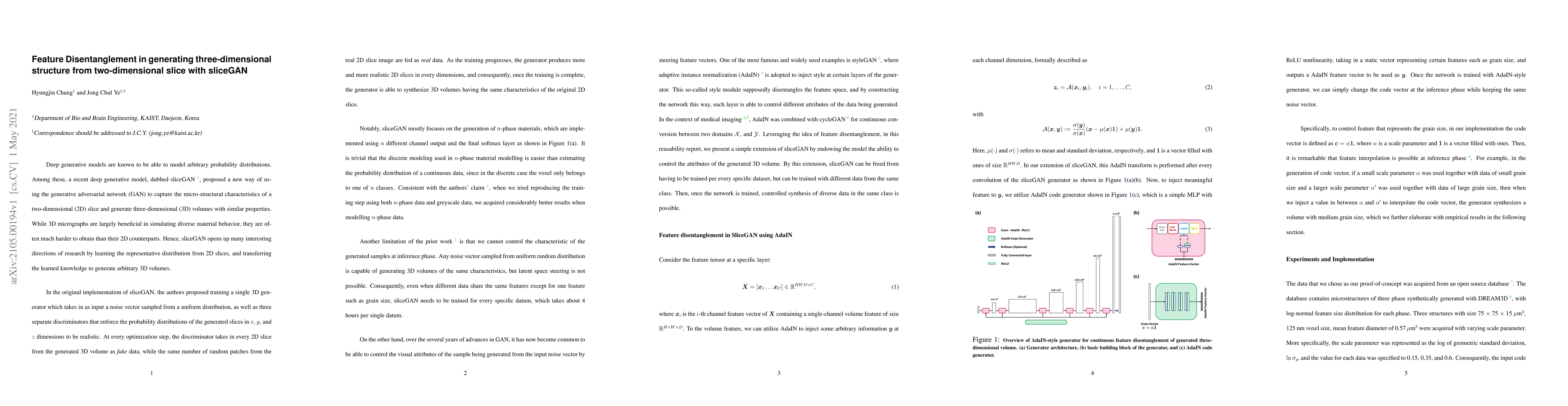 This paper proposes combining sliceGAN with AdaIN to disentangle features and control the generation of 3D volumes from 2D slices, addressing the limitation of sliceGAN's inability to steer the latent space. This approach aims to generate realistic 3D micrographs from 2D data, facilitating simulations of material behavior.