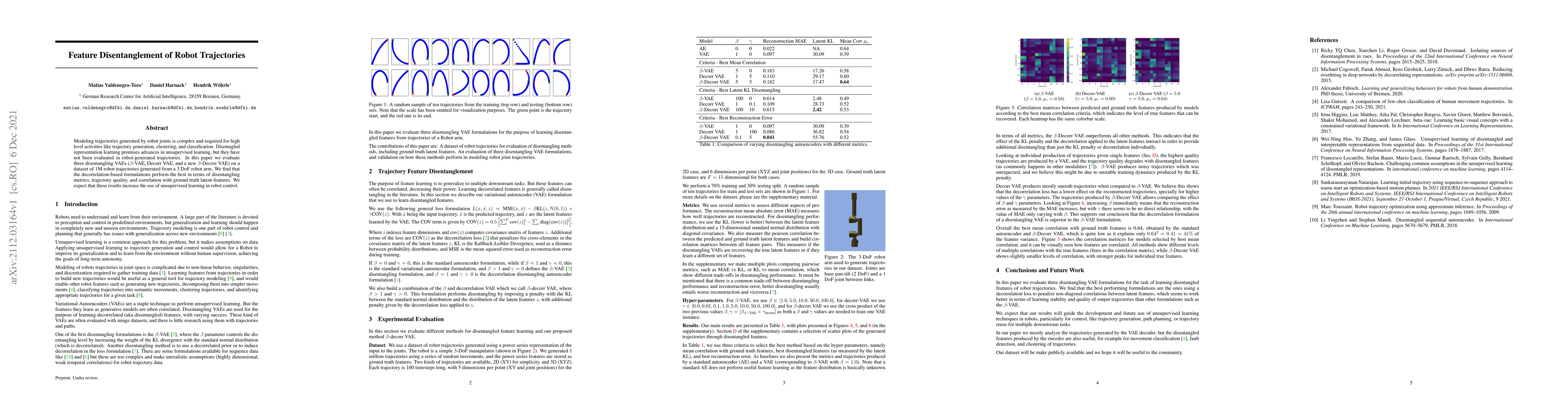 Researchers evaluate disentangling VAEs on robot-generated trajectories, finding decorrelation-based methods outperform in terms of disentanglement and trajectory quality.