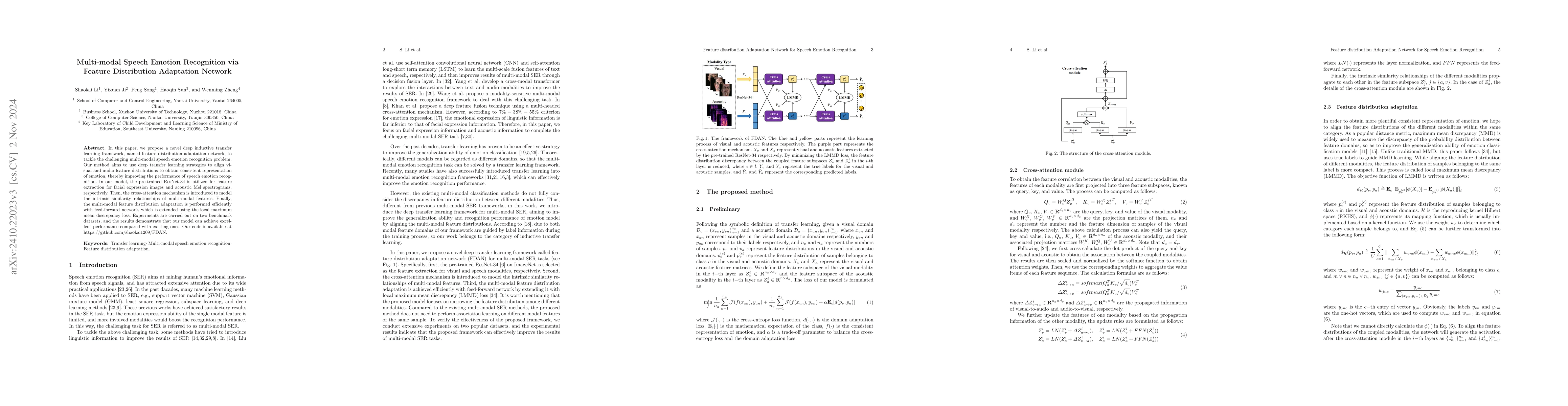 This paper introduces a deep transfer learning framework called Feature Distribution Adaptation Network to enhance speech emotion recognition by aligning visual and audio feature distributions. It employs pre-trained ResNet-34 for feature extraction and uses a cross-attention mechanism and local maximum mean discrepancy loss for multi-modal adaptation, achieving superior results on benchmark datasets.