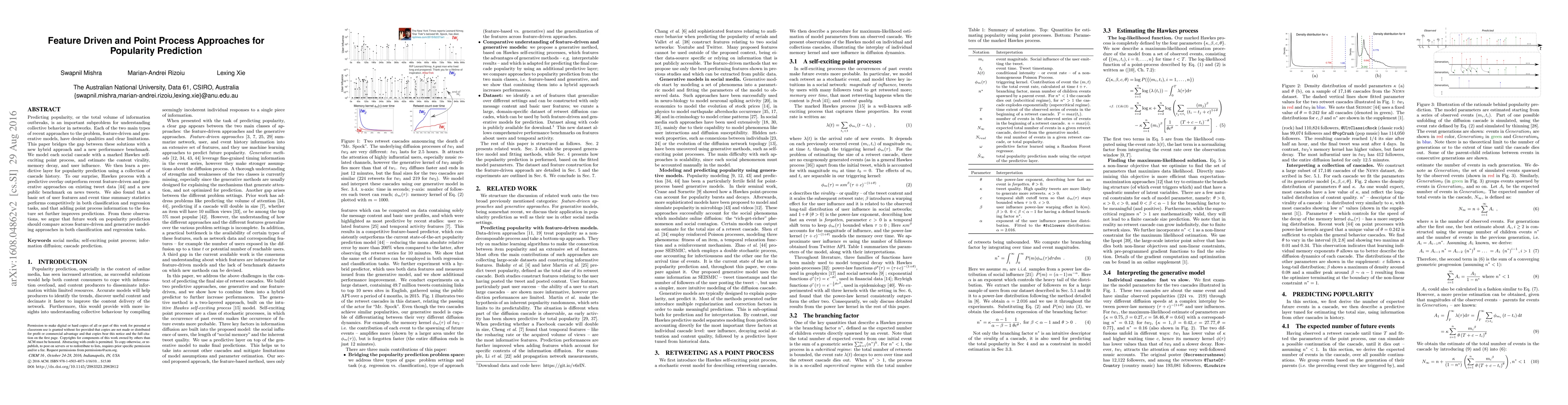 Predicting popularity, or the total volume of information outbreaks, is an important subproblem for understanding collective behavior in networks. Each of the two main types of recent approaches to the problem, feature-driven and generative models, have desired qualities and clear limitations. This paper bridges the gap between these solutions with a new hybrid approach and a new performance benchmark. We model each social cascade with a marked Hawkes self-exciting point process, and estimate the content virality, memory decay, and user influence. We then learn a predictive layer for popularity prediction using a collection of cascade history. To our surprise, Hawkes process with a predictive overlay outperform recent feature-driven and generative approaches on existing tweet data [43] and a new public benchmark on news tweets. We also found that a basic set of user features and event time summary statistics performs competitively in both classification and regression tasks, and that adding point process information to the feature set further improves predictions. From these observations, we argue that future work on popularity prediction should compare across feature-driven and generative modeling approaches in both classification and regression tasks.