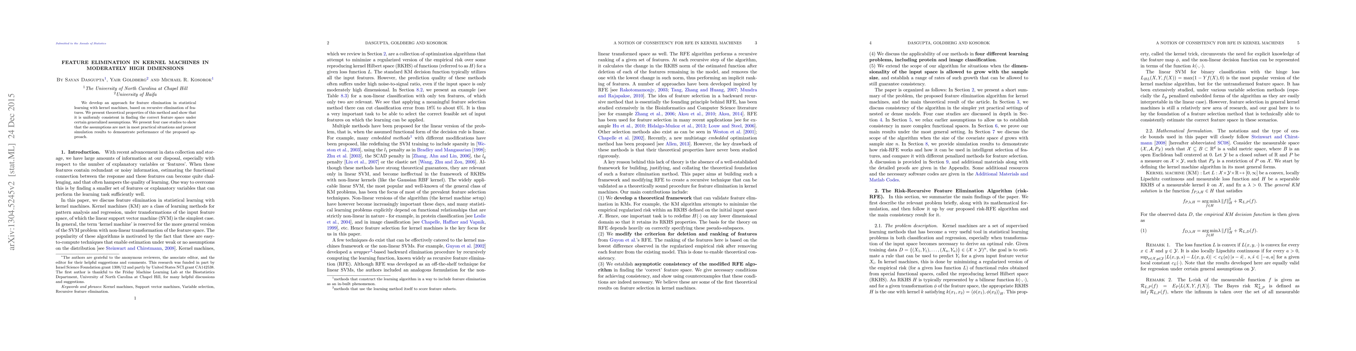 This paper proposes a recursive feature elimination method for kernel machines, demonstrating its theoretical consistency and effectiveness through practical case studies and simulations. The approach aims to identify the most relevant features in moderately high-dimensional data.