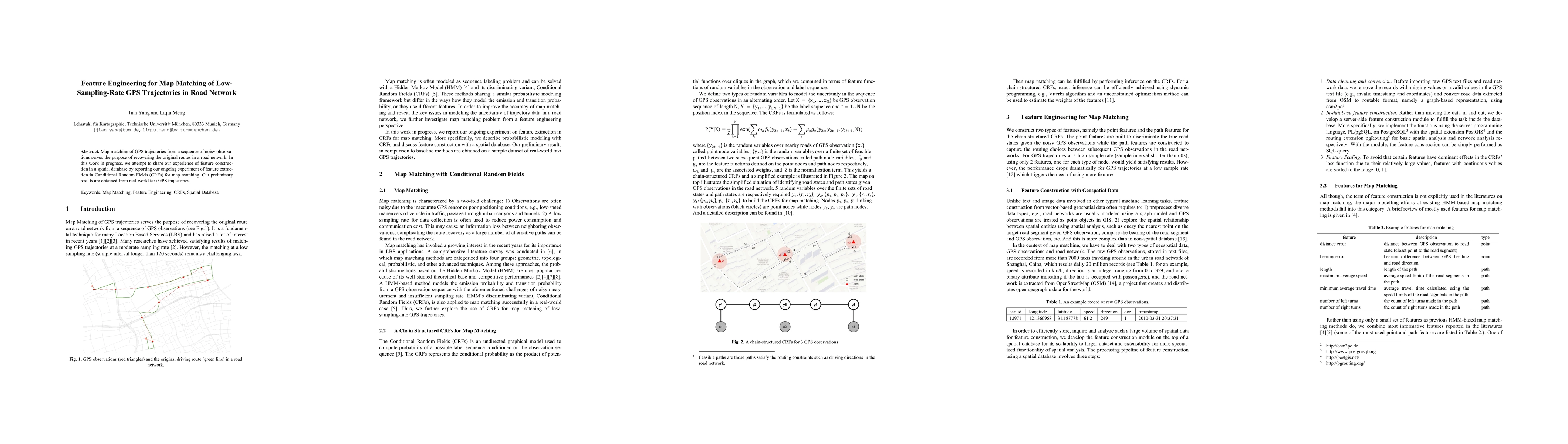 This research paper explores feature engineering for map matching low-sampling-rate GPS trajectories using Conditional Random Fields (CRFs). Preliminary results from real-world taxi GPS data indicate promising outcomes in reconstructing original routes in a road network.