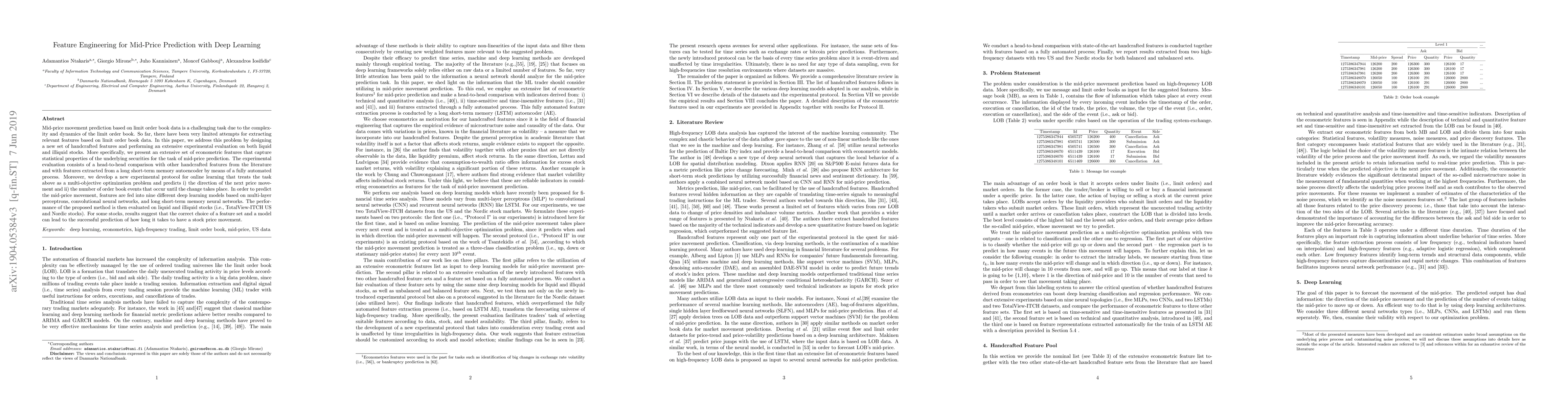 Mid-price movement prediction based on limit order book (LOB) data is a challenging task due to the complexity and dynamics of the LOB. So far, there have been very limited attempts for extracting relevant features based on LOB data. In this paper, we address this problem by designing a new set of handcrafted features and performing an extensive experimental evaluation on both liquid and illiquid stocks. More specifically, we implement a new set of econometrical features that capture statistical properties of the underlying securities for the task of mid-price prediction. Moreover, we develop a new experimental protocol for online learning that treats the task as a multi-objective optimization problem and predicts i) the direction of the next price movement and ii) the number of order book events that occur until the change takes place. In order to predict the mid-price movement, the features are fed into nine different deep learning models based on multi-layer perceptrons (MLP), convolutional neural networks (CNN) and long short-term memory (LSTM) neural networks. The performance of the proposed method is then evaluated on liquid and illiquid stocks, which are based on TotalView-ITCH US and Nordic stocks, respectively. For some stocks, results suggest that the correct choice of a feature set and a model can lead to the successful prediction of how long it takes to have a stock price movement.