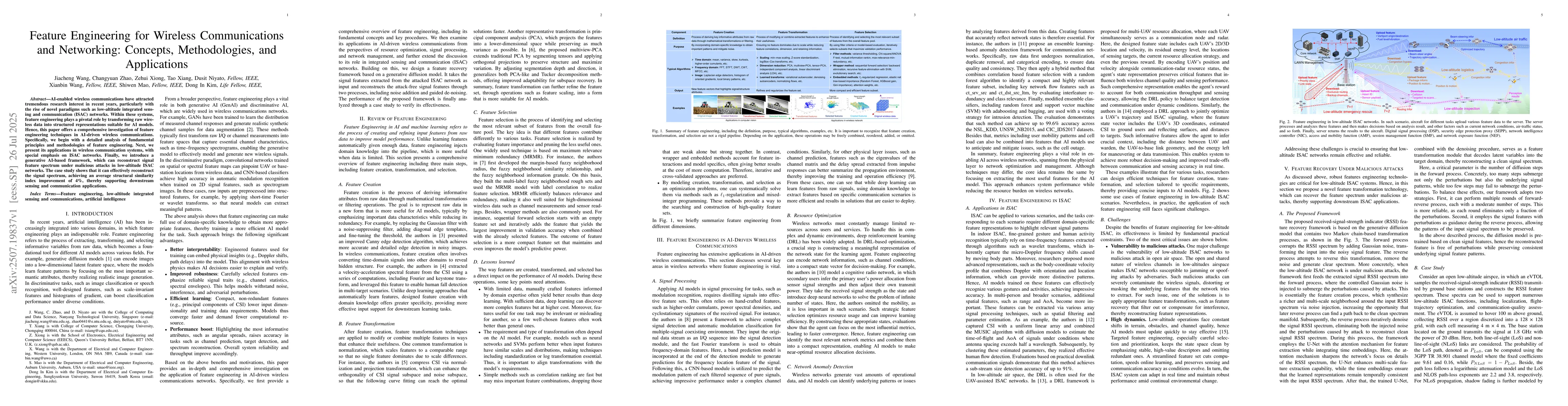 AI-enabled wireless communications have attracted tremendous research interest in recent years, particularly with the rise of novel paradigms such as low-altitude integrated sensing and communication (ISAC) networks. Within these systems, feature engineering plays a pivotal role by transforming raw wireless data into structured representations suitable for AI models. Hence, this paper offers a comprehensive investigation of feature engineering techniques in AI-driven wireless communications. Specifically, we begin with a detailed analysis of fundamental principles and methodologies of feature engineering. Next, we present its applications in wireless communication systems, with special emphasis on ISAC networks. Finally, we introduce a generative AI-based framework, which can reconstruct signal feature spectrum under malicious attacks in low-altitude ISAC networks. The case study shows that it can effectively reconstruct the signal spectrum, achieving an average structural similarity index improvement of 4%, thereby supporting downstream sensing and communication applications.