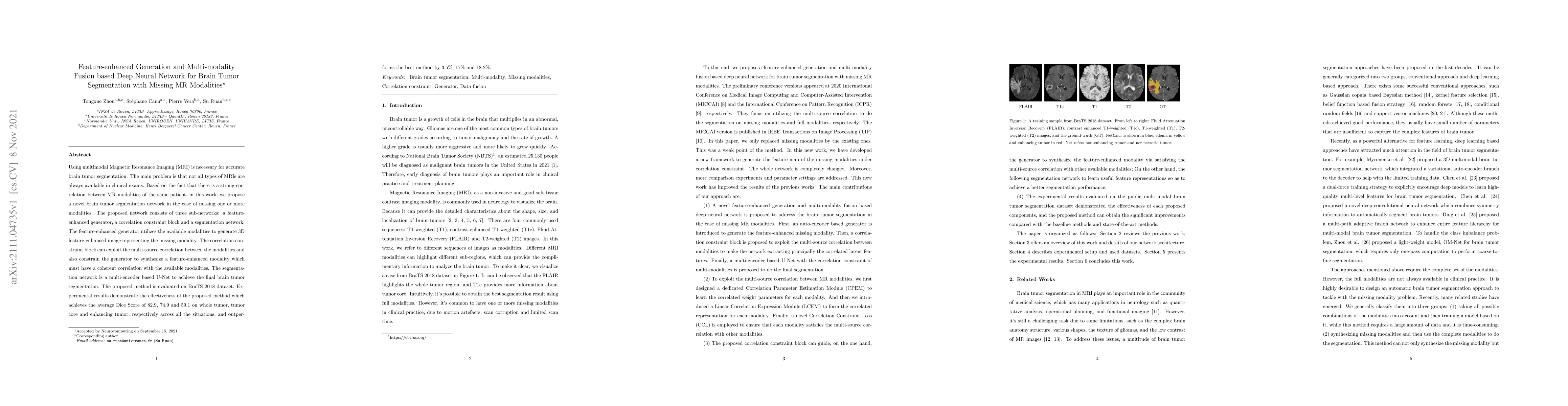 This paper proposes a deep neural network for brain tumor segmentation using multimodal MRI, addressing the issue of missing modalities by generating a feature-enhanced synthetic modality. The network includes a feature-enhanced generator, a correlation constraint block, and a segmentation U-Net, achieving an average Dice Score of 82.9, 74.9, and 59.1 for whole tumor, tumor core, and enhancing tumor, respectively, outperforming existing methods.