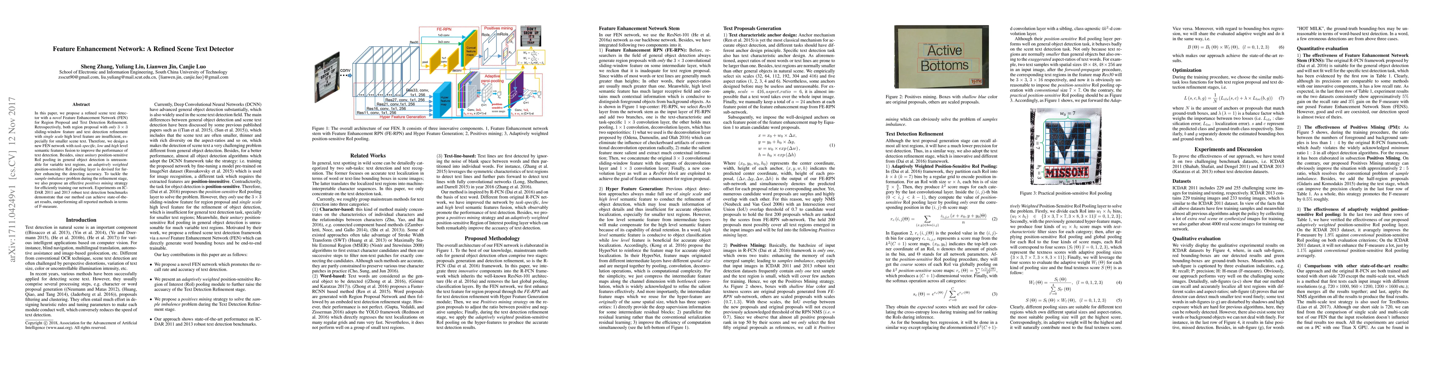 This paper introduces a refined scene text detector utilizing a novel Feature Enhancement Network (FEN) that combines low and high-level semantic features to enhance detection accuracy. The adaptively weighted position-sensitive RoI pooling and a positives mining strategy further improve performance, achieving state-of-the-art results on ICDAR benchmarks.