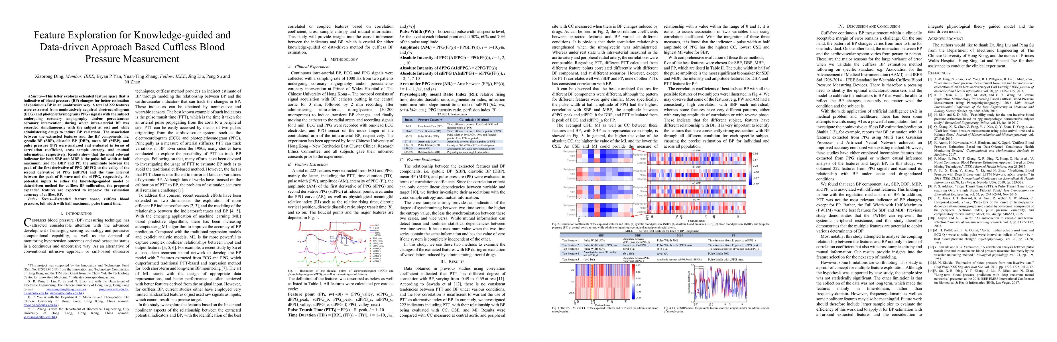 This study explores extended feature space that is indicative of blood pressure (BP) changes for better estimation of continuous BP in an unobtrusive way. A total of 222 features were extracted from noninvasively acquired electrocardiogram (ECG) and photoplethysmogram (PPG) signals with the subject undergoing coronary angiography and/or percutaneous coronary intervention, during which intra-arterial BP was recorded simultaneously with the subject at rest and while administering drugs to induce BP variations. The association between the extracted features and the BP components, i.e. systolic BP (SBP), diastolic BP (DBP), mean BP (MBP), and pulse pressure (PP) were analyzed and evaluated in terms of correlation coefficient, cross sample entropy, and mutual information, respectively. Results show that the most relevant indicator for both SBP and MBP is the pulse full width at half maximum, and for DBP and PP, the amplitude between the peak of the first derivative of PPG (dPPG) to the valley of the second derivative of PPG (sdPPG) and the time interval between the peak of R wave and the sdPPG, respectively. As potential inputs to either the knowledge-guided model or data-driven method for cuffless BP calibration, the proposed expanded features are expected to improve the estimation accuracy of cuffless BP.